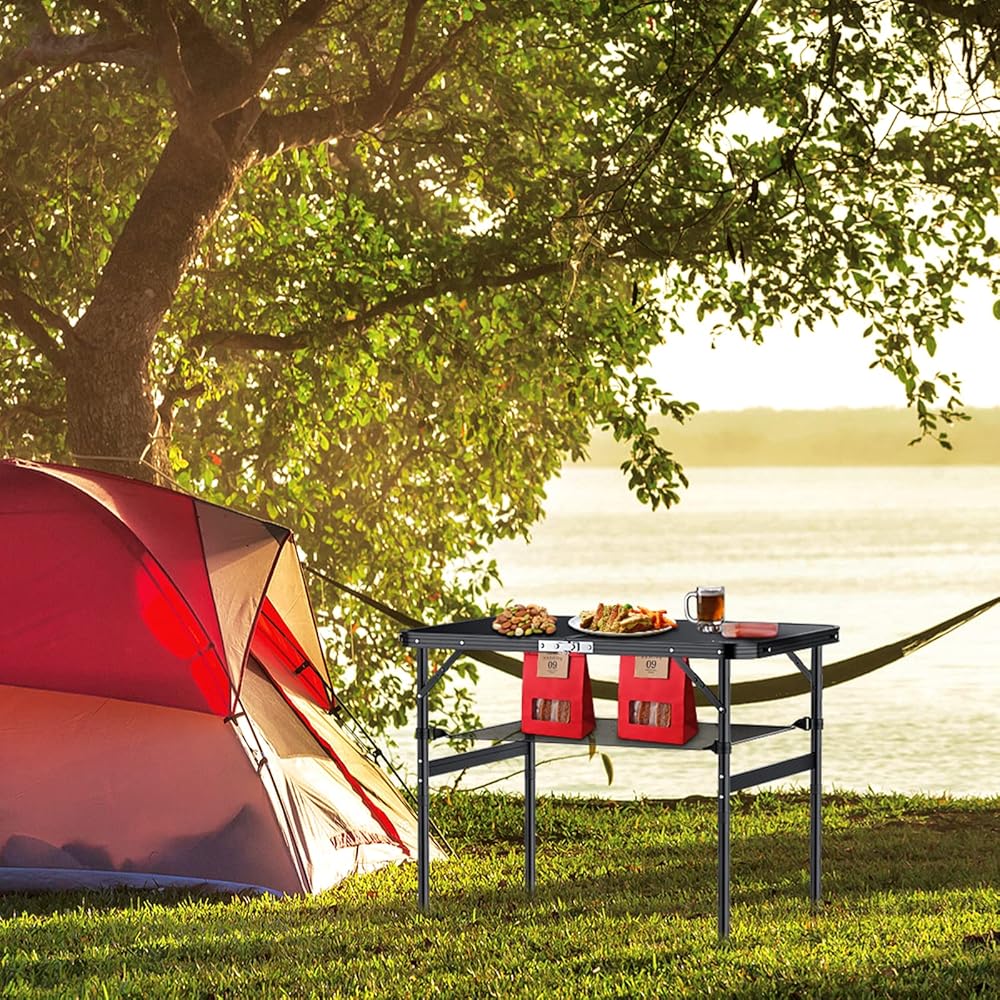 مواد عالية الجودة للأمان والاستقرار: الإطار الكامل لطاولة التخييم مصنوع من خليط معدني من الألومنيوم السميك، ويزن 7 باوند، ولكن يمكنه تحمل 70 باوند، مما يجعلها خفيفة الوزن ومتينة للغاية. سطح الطاولة من خشب ليفي متوسط الكثافة ناعم وسهل التنظيف.