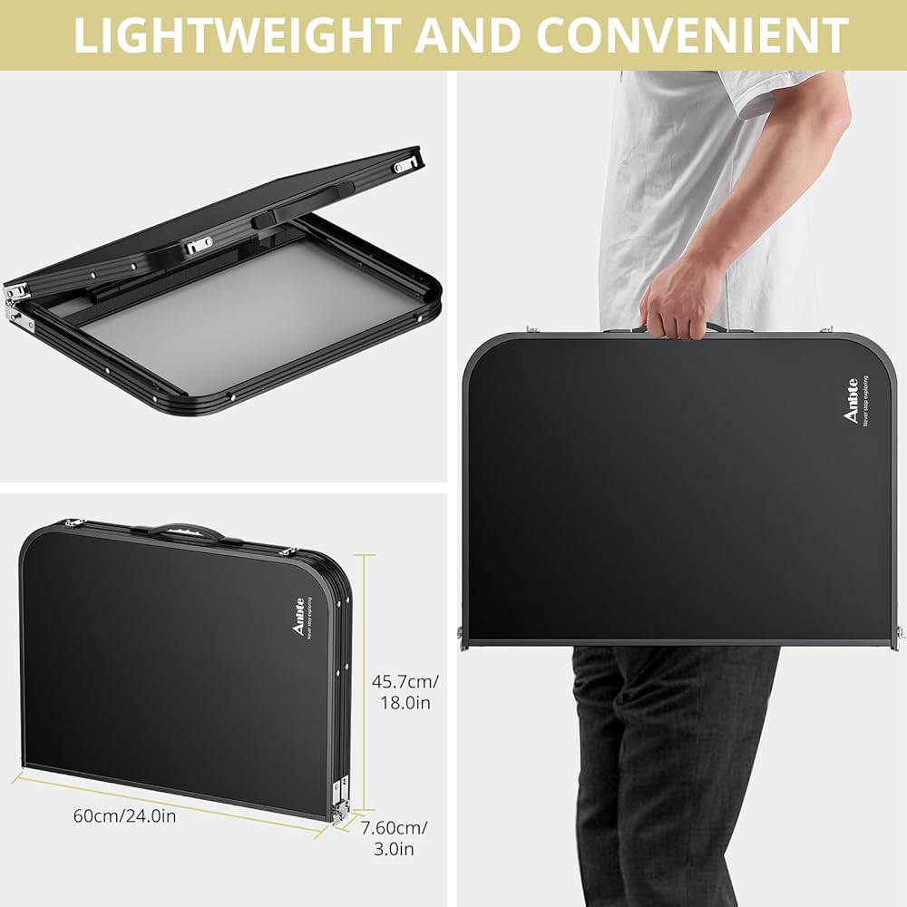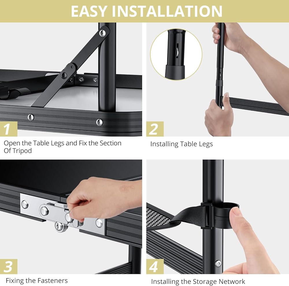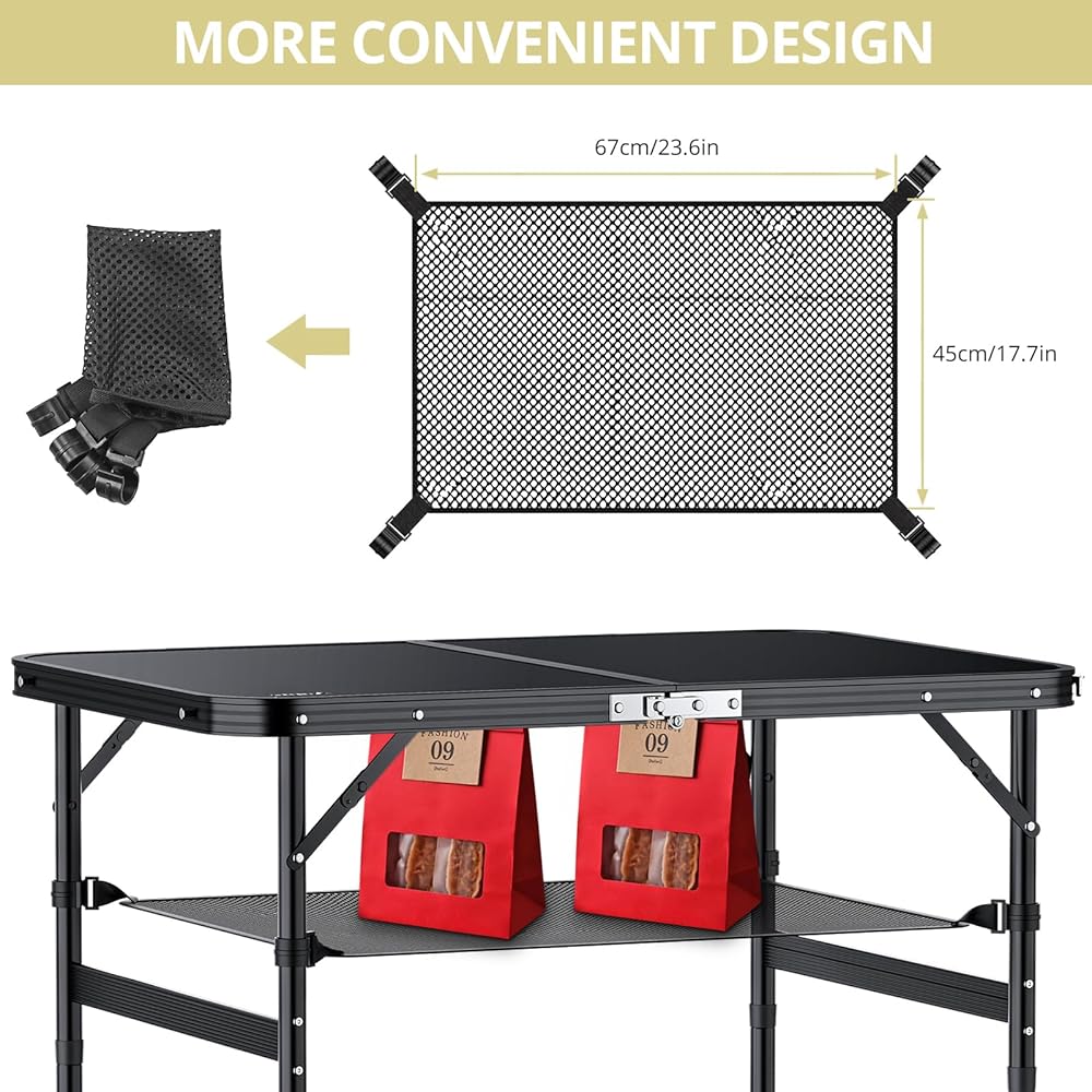 حجم أكبر ومساحة تخزين إضافية - يبلغ حجم الطاولة القابلة للطي 36 انش طول × 24 انش عرض وتأتي مع شبكة تخزين، مما يوفر مساحة كبيرة للاستخدام. يمكن إزالة شبكة التخزين بسرعة من 4 أرجل عندما لا تحتاج إليها.