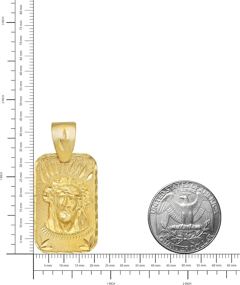 Dimensional detail and reflective shine unite in this 21mm x 34mm ID tag pendant that displays a subtly elevated Jesus face accented and edged by shimmering diamond-cuts. Gleaming with heavy 14k gold plating, it's suspended by a diamond-cut bail.