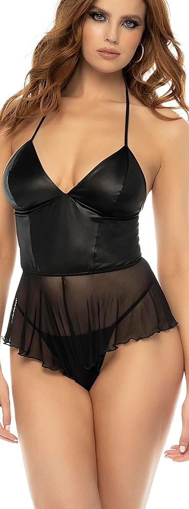An elegant yet simple upgrade of a timeless design. This romper is crafted from wet-look fabric and transparent mesh, featuring a halter neck-tie and a matching thong.