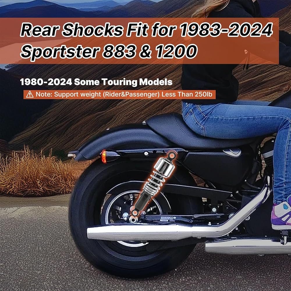 • الإعداد: ممتصات الصدمات الخلفية لدينا مثالية لـ 1983-2024 Sportster 883 & 1200. عادة ما تكون الصدمات الخلفية لدينا متوافقة مع 1980-2024 Harley Touring FLT/FLHT/FLHR/FLTR/FLHX (باستثناء الدراجة ثلاثية العجلات والنماذج مع خرطوشة الشوكة).