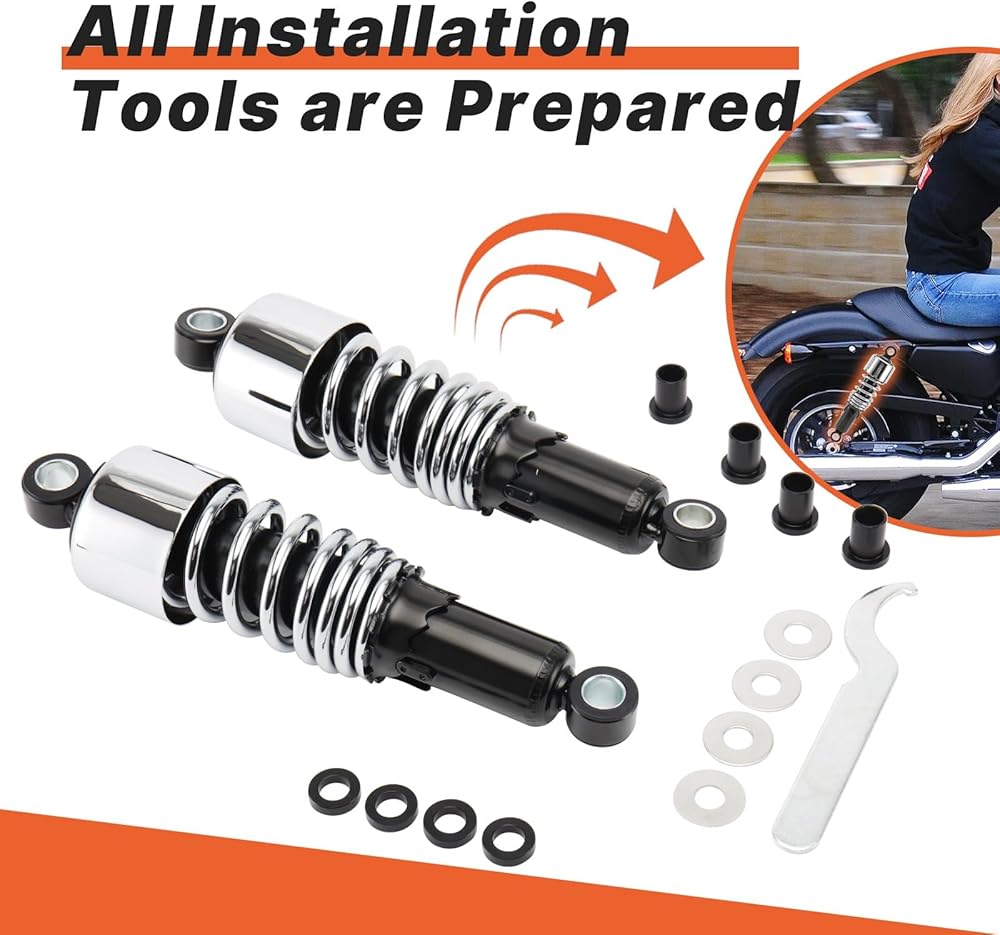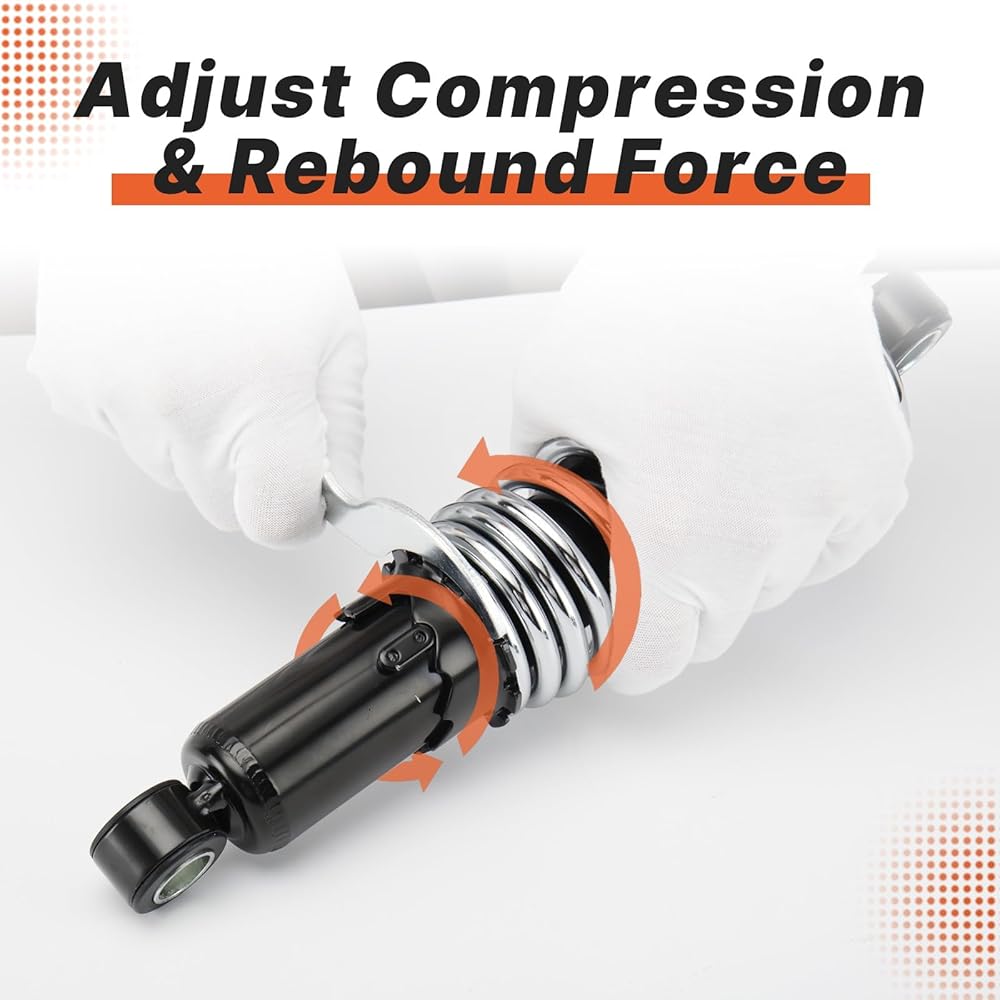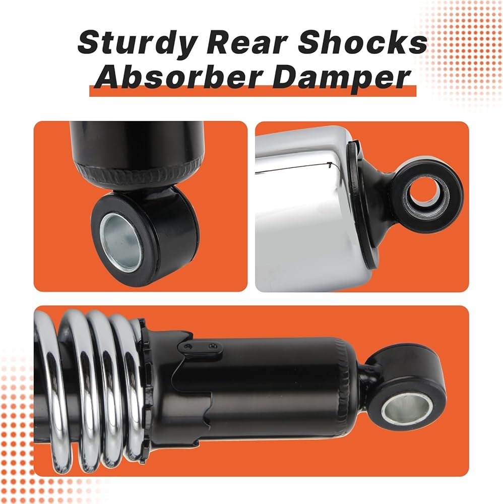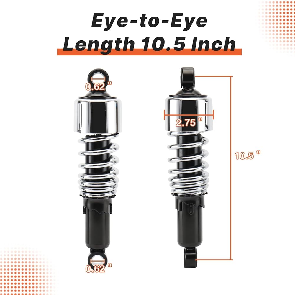 • ملاحظة: يبلغ طول طقم ممتصات الصدمات الخلفية 10 1/2 بوصة ويقاس من العين إلى العين. سوف يناسب دراجتك النارية إذا كان ممتص الصدمات الخلفي الخاص بها مقاس 10.5 بوصة. إنه يعمل بشكل جيد إذا كان الوزن الإجمالي للراكب والركاب لا يزيد عن 250 رطلاً.