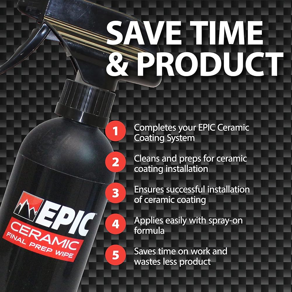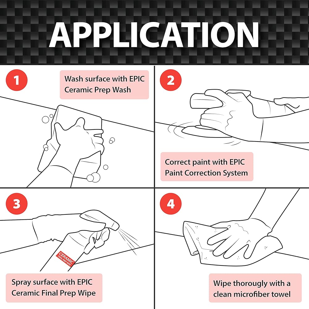 • الخطوة النهائية قبل تطبيق السيراميك: تعد المسحة النهائية للسيراميك من EPIC هي الخطوة النهائية، قبل تطبيق طلاء السيراميك. وهو عنصر حاسم في نظام طلاء السيراميك EPIC.