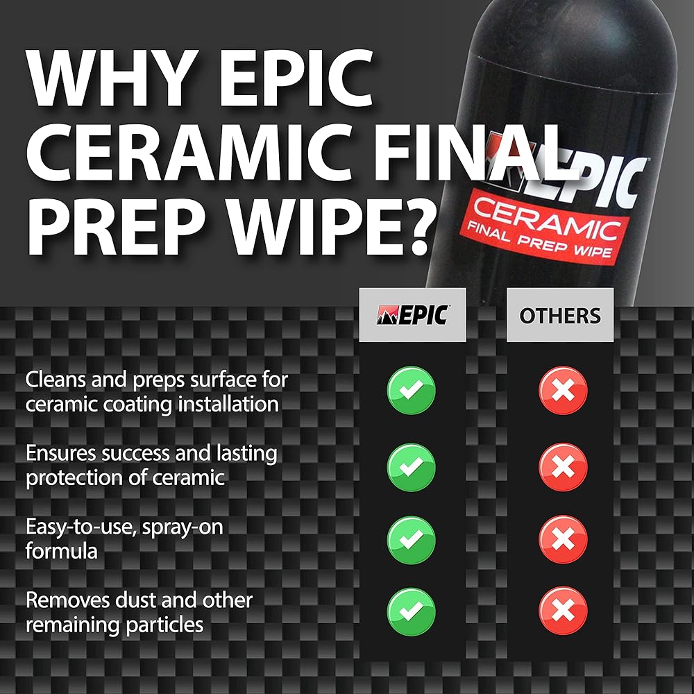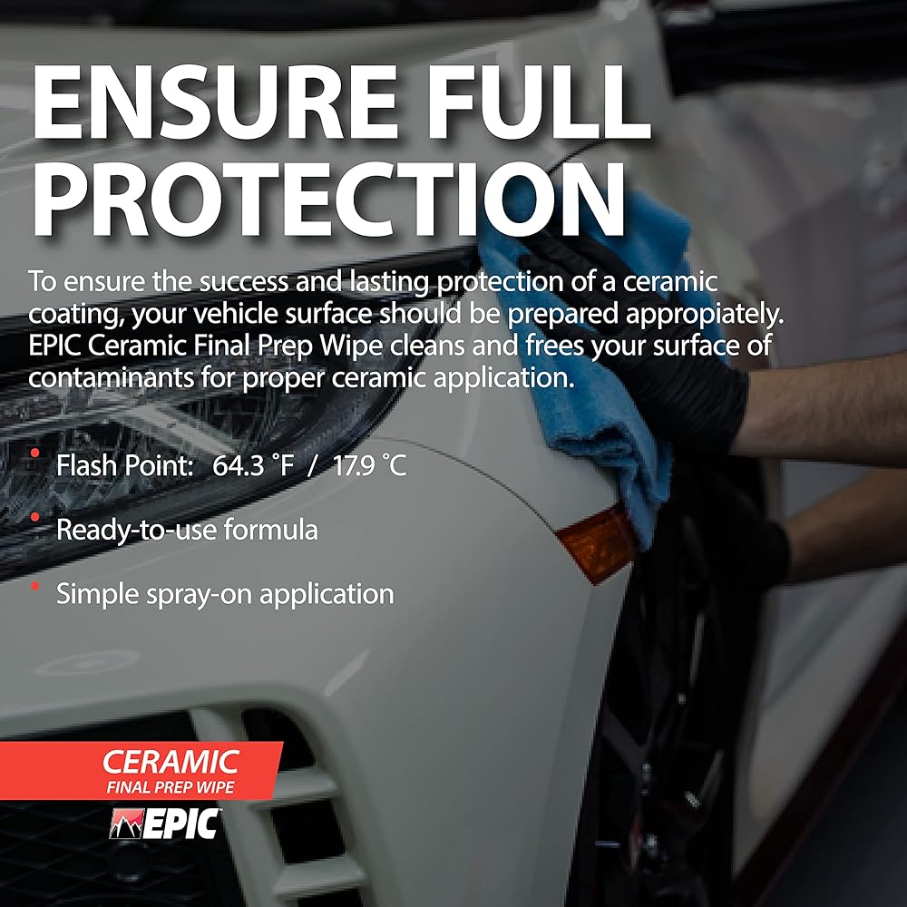 • آمنة لجميع العلامات التجارية: تعتبر مناديل EPIC Ceramic Final Prep Wipe آمنة لجميع العلامات التجارية لطلاء السيراميك والشمع.