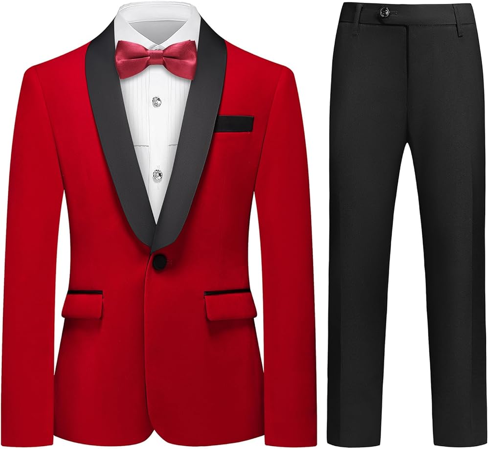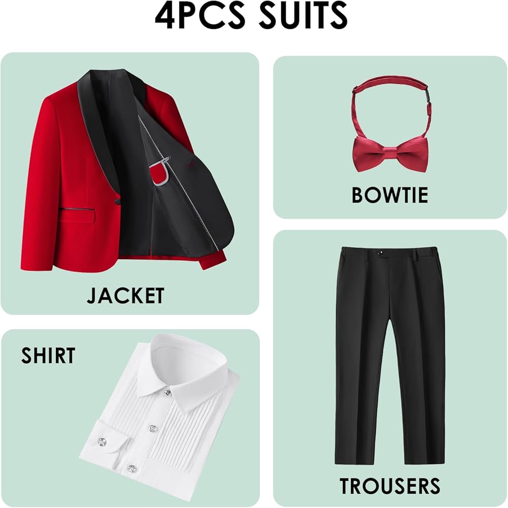 【بدلة توكسيدو مكونة من 4 قطع】: تشتمل المجموعة الرسمية للأولاد على سترة مخملية وقميص أبيض وبنطلون وربطة عنق (بدلة سوداء/أزرق ياقوتي/أخضر مع ربطة عنق سوداء في العبوة، بدلة عنابي/أحمر مع فيونكة حمراء التعادل في الحزمة).