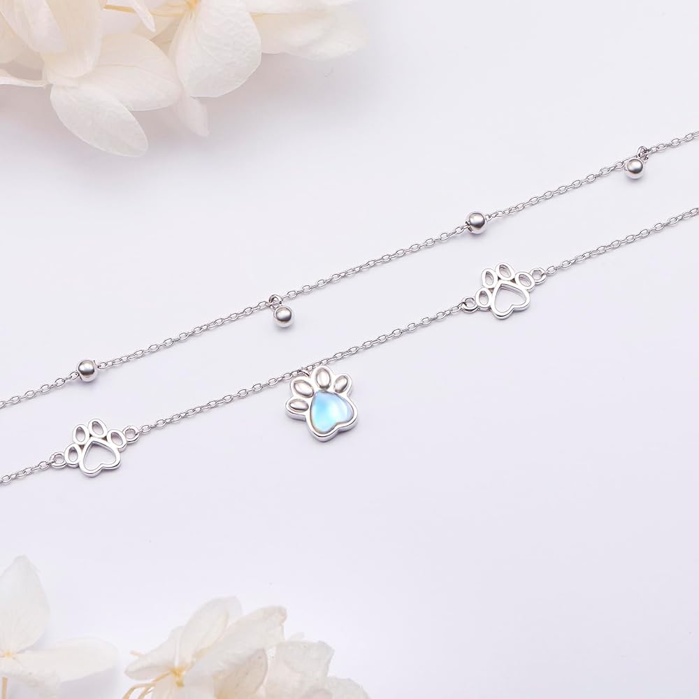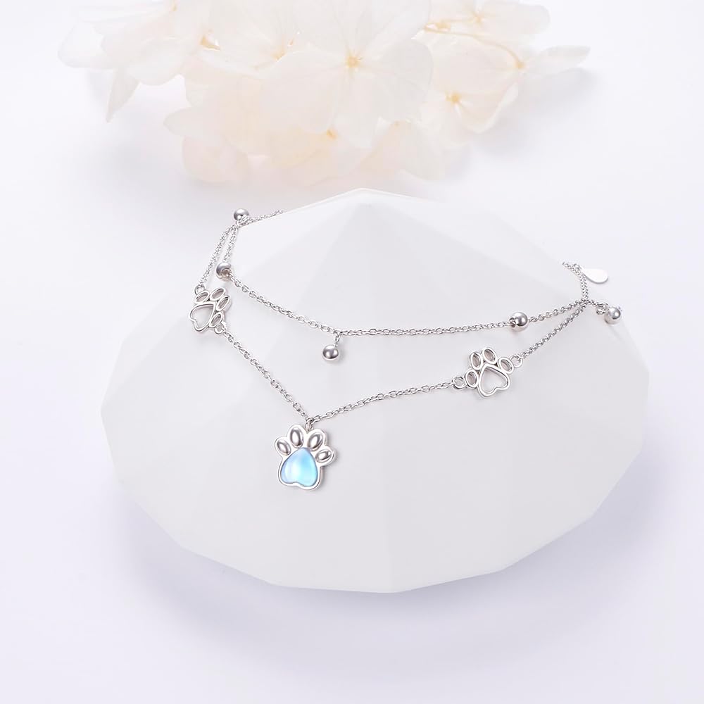 S925 فضة استرلينية للجرو والكلب والقطط والحيوانات الأليفة مطبوعة على شكل مخالب حجر القمر سلسلة مزدوجة للقدم سحر قابل للتعديل طبقة خلخال سوار كبير مجوهرات هدية للنساء