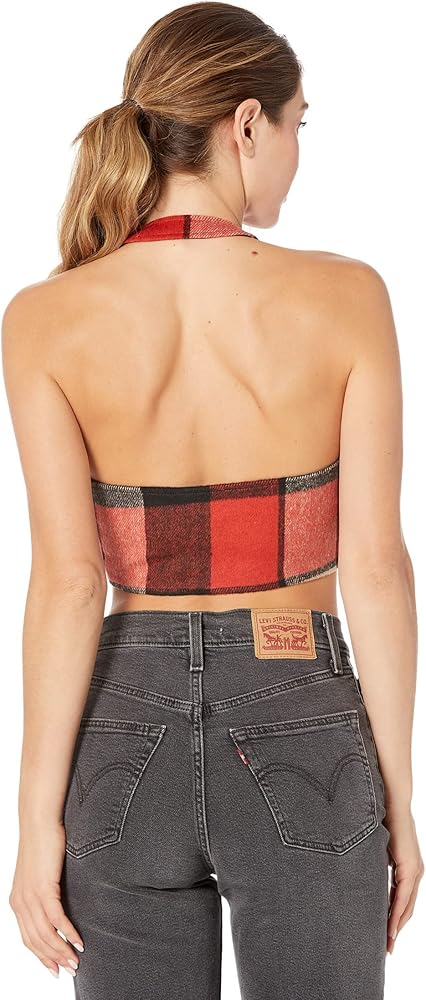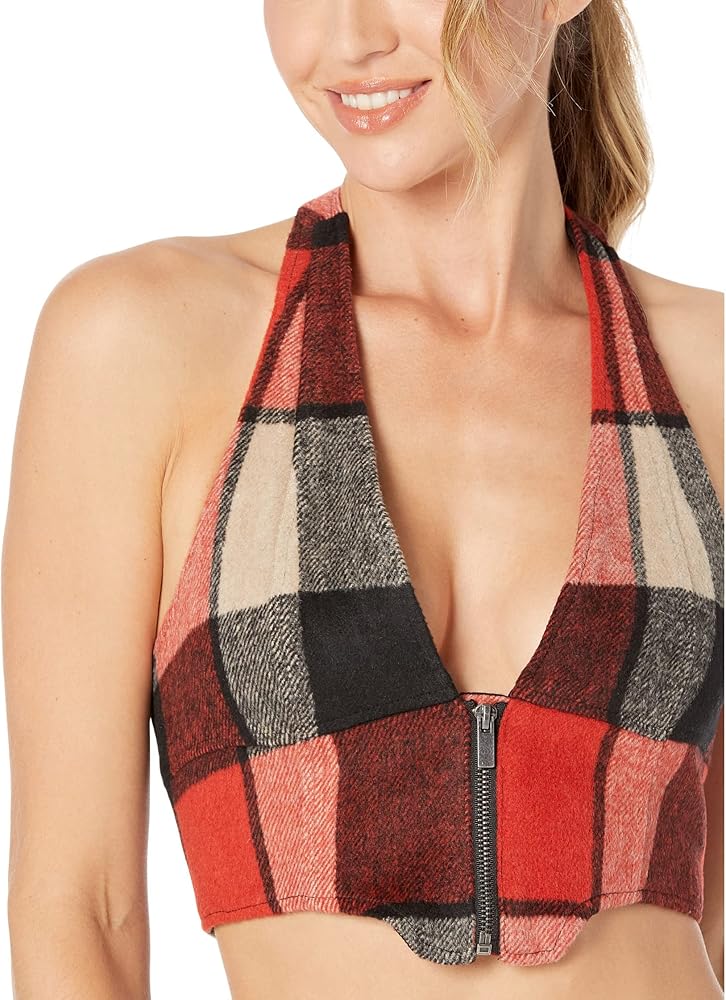 Look chic and stay comfortable by wearing AFRM Neva Zip Corset Top. Halter neck. Exposed front zipper closure. Wide chest band. Block checkered patterns. 100% polyester. Machine wash, tumble dry.