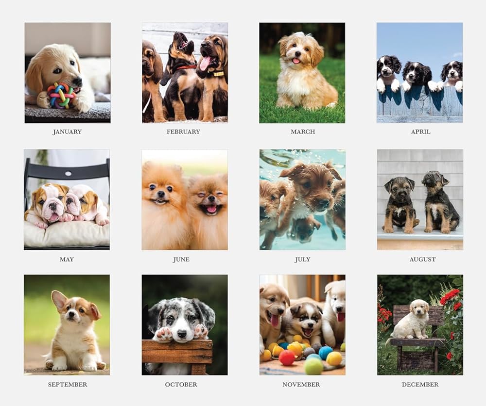 Each monthly calendar page contains a puppy photo, a full 12-month reference calendar and a note section on the right for longer term planning