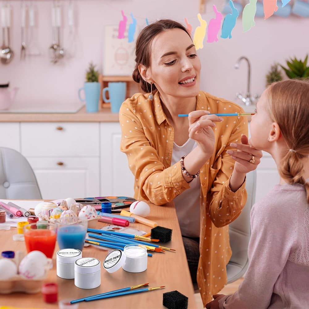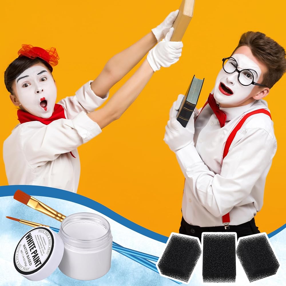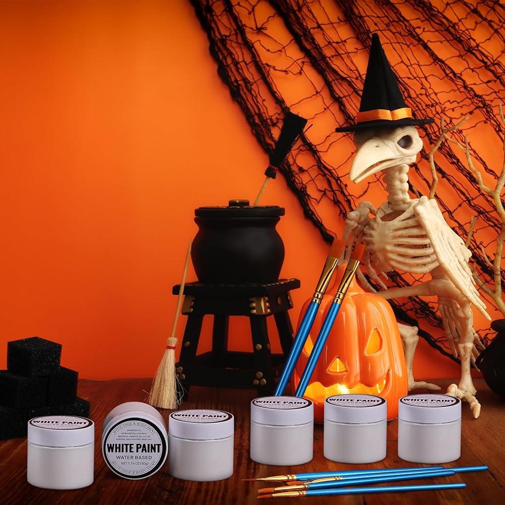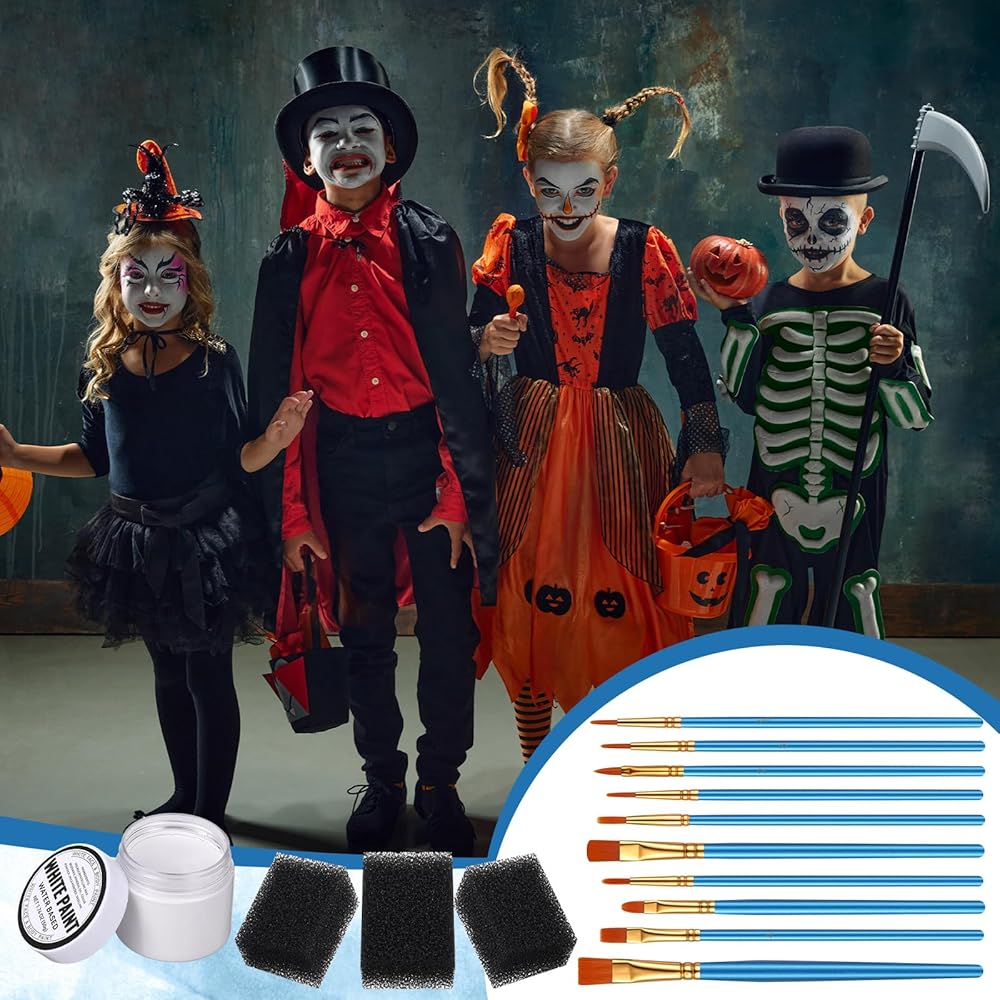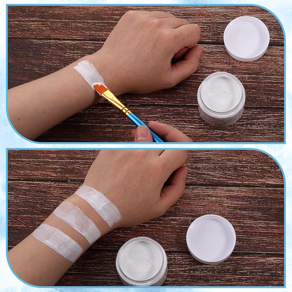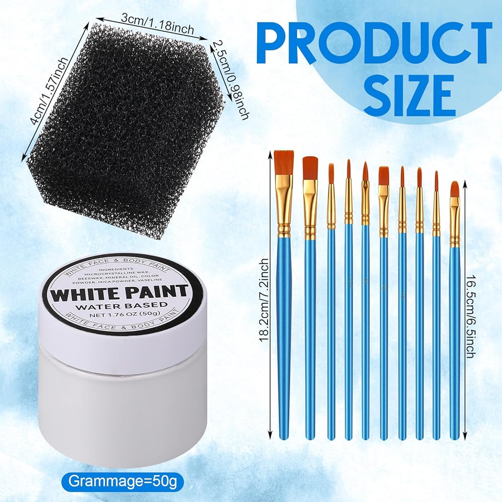 Unleash your creativity with our versatile face painting kit, suitable for Halloween, costume parties, and cosplay events. This set comes with 6 water soluble white face paints, 10 pearlescent blue brushes made with wooden material for precise application, and 6 black sponges for seamless blending.