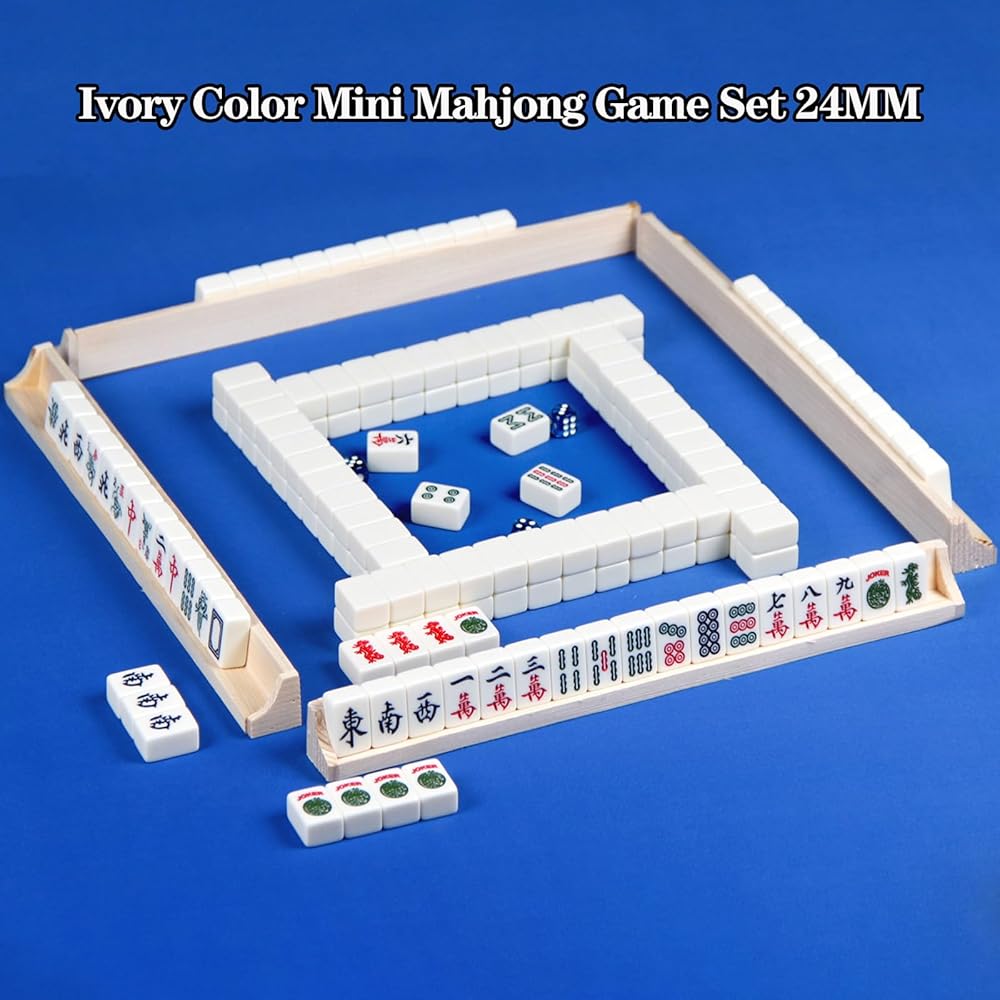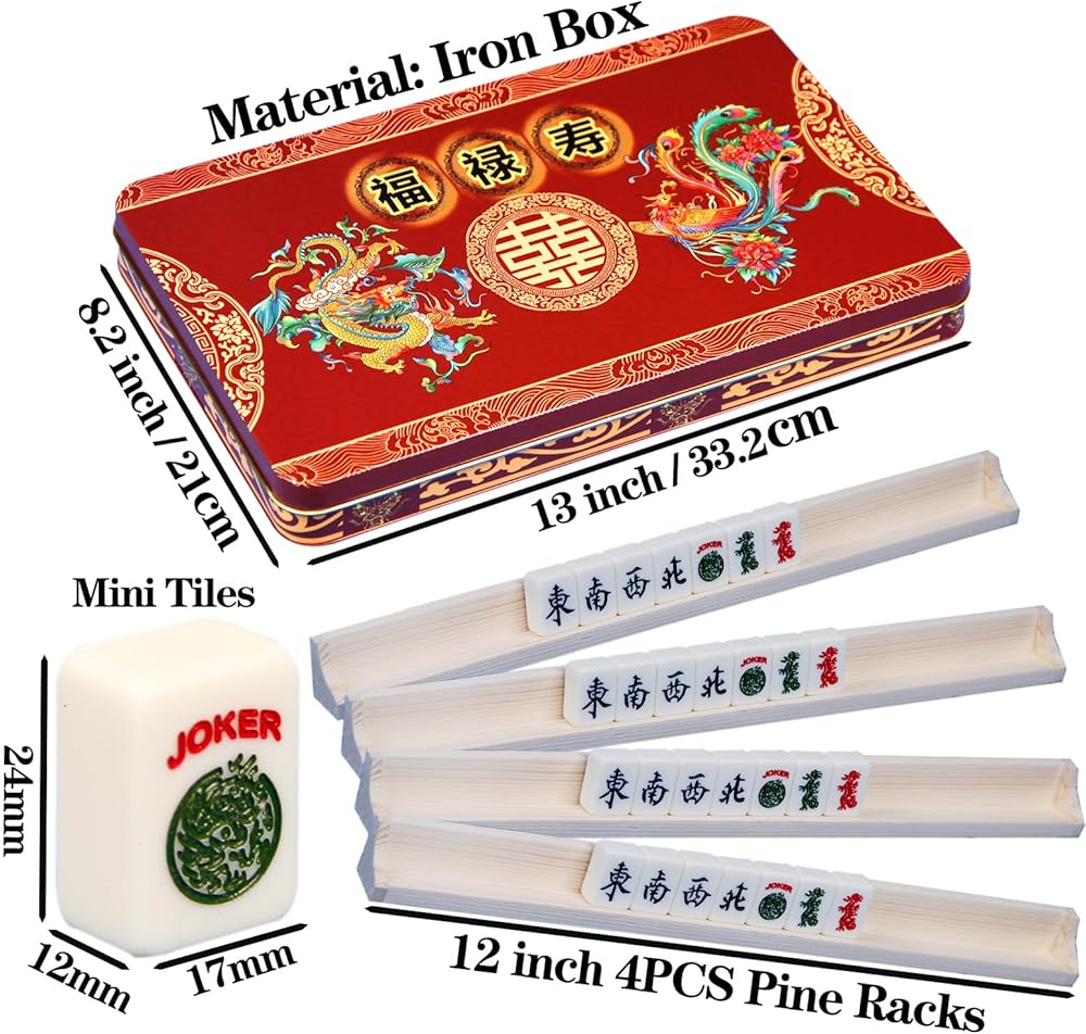• مجموعة ماجونج صغيرة كاملة: تتضمن مجموعات ماجونج بالحجم الكامل 36 دائرة، و36 خيزران، و36 شخصية، و12 تنينًا، و24 رياحًا، و16 زهرة، و10 جوكر، و4 قطع غيار فارغة، مقاس كل بلاط: 0.95 × 0.66 × 0.47 بوصة (24 × 17 × 12 مم)، 1 صندوق حديد -4 رفوف ماجونغ -2 تعليمات باللغة الإنجليزية -3 نرد