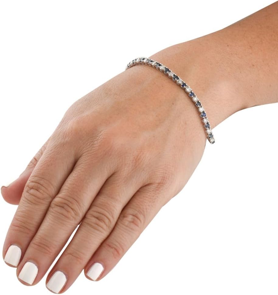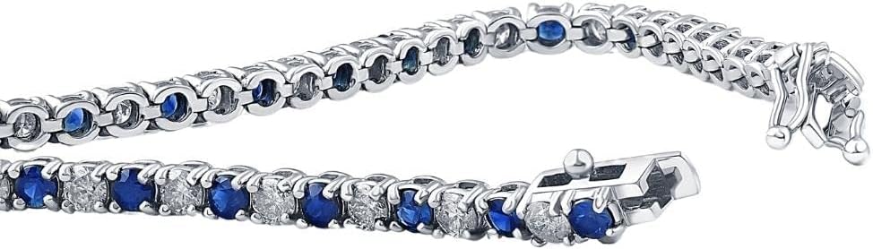 سوار التنس من الذهب الأبيض عيار 14 قيراط والماس المستدير: يتميز سوار التنس ذو الطراز الكلاسيكي بالألماس الأبيض والياقوت الأزرق. جميع الأحجار مرصعة بالذهب الأبيض عيار 14 قيراط. السوار مؤمن بواسطة أ