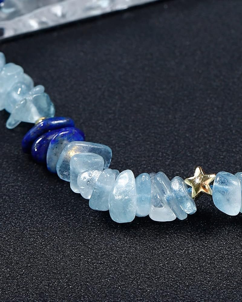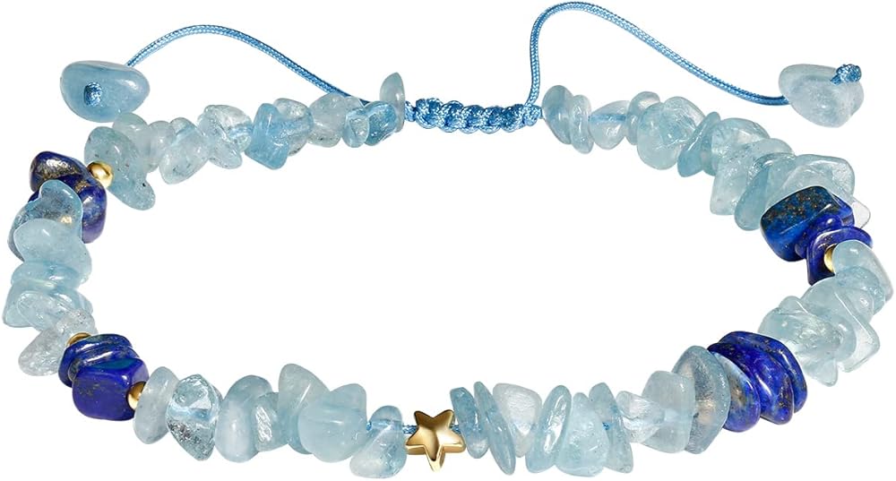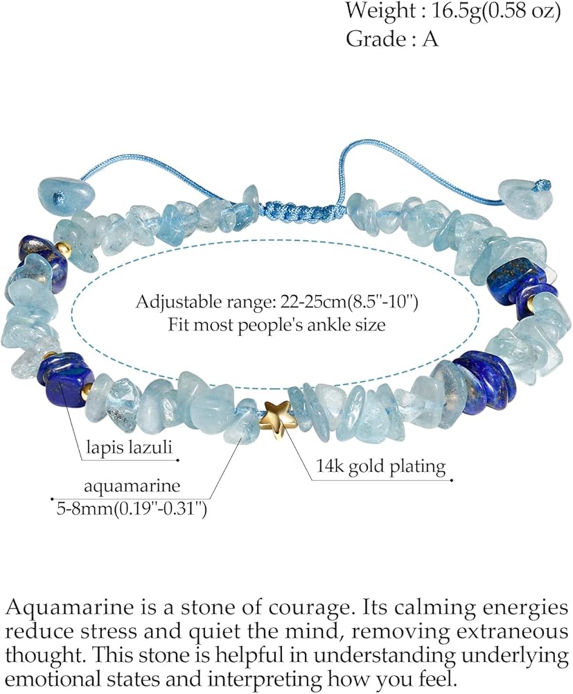 • المواد: الخلخال مصنوع من الزبرجد ومزين باللازورد، النجمة: مطلي بالذهب عيار 14 قيراط، مقاس الخرزة 5-8 مم (0.19 بوصة - 0.31 بوصة)، الوزن: 16.5 جم (0.58 أونصة)، نطاق قابل للتعديل: 22-25 سم ( 8.5"-10")، يناسب مقاس كاحل معظم الأشخاص؛