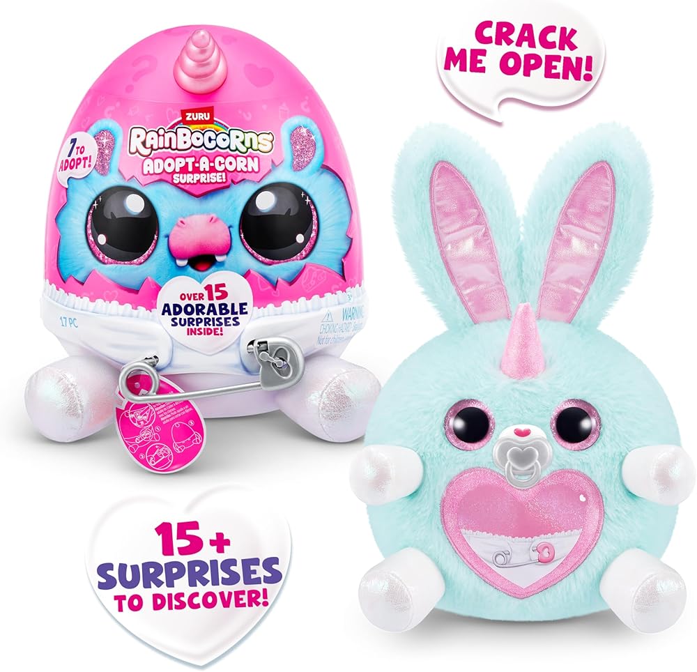 Adopt a brand new bestie with all-new Adopt-A-Corns! The cutest little baby Rainbocorns are crawling around Rainboville and are in need for your love and care! Unclip your Adopt-A-Corn out of its diaper for adventurous fun and clip back once it's time for some rest. Don't forget about the pacifier! There are 7 Adopt-A-Corns to adopt. Each egg comes with over 15 adorable surprises inside!