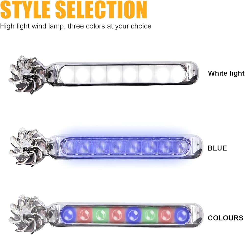 Tips for Use: No wiring is required, and the wind energy generated during driving is used. When the vehicle speed reaches 30 yards, the LED light will light up. Besides, this product is equipped with 3M adhesive sticker for easy and convenient installation.