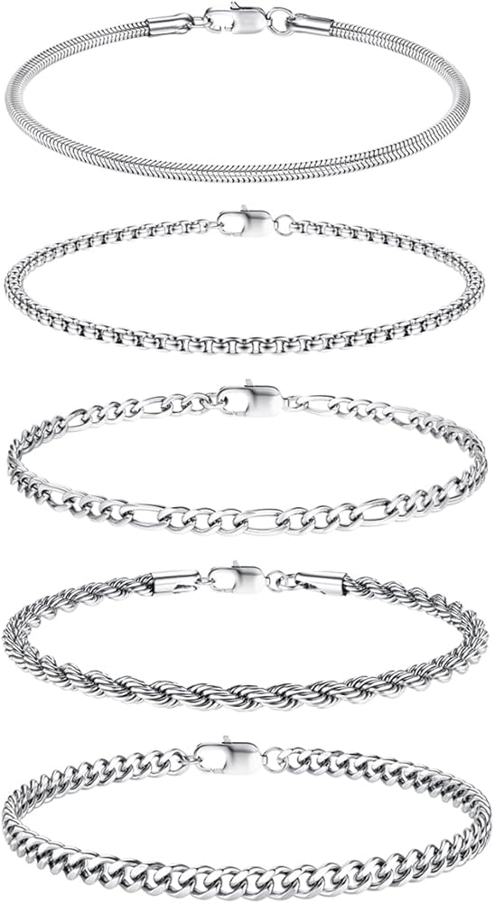 أساور سلسلة للرجال: تتكون هذه الأساور القابلة للتكديس للرجال من 5 أساور سلسلة. بما في ذلك سلسلة حبل، سلسلة مشبك ورق، سلسلة فيجارو، أساور سلسلة ربط كوبية. لديك خيار كيفية ارتدائها في حياتك اليومية، فهي تبدو رائعة عند تجميعها معًا أو بشكل فردي، وجريئة وأنيقة بما يكفي لتناسب جميع أنماط الملابس. خيار اقتصادي أيضًا بالنسبة لك