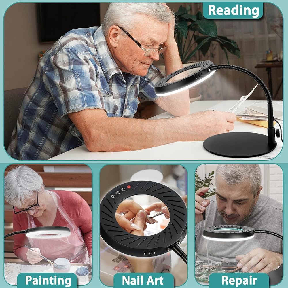 تصميم إضاءة المصباح المكبر: يأتي مصباح المكتب المكبر المزود بالضوء مع رقبة معقوفة مرنة مقاس 12 بوصة يمكنك ضبطها حسب رغبتك، مما يجعل الضوء موضوعًا بدقة يضيء منطقة عملك. يوفر هذا الضوء المكبر تفاصيل مكبرة واضحة وإضاءة ناعمة مناسبة لقراءة الكتب أو الإصلاح أو الخياطة أو اللحام أو الرسم أو الرسم أو التطريز، مما يسمح لك بالتركيز على العمل الجيد وزيادة الكفاءة. لن تشعر بإجهاد العين أو الدوخة حتى عند التركيز على المشاريع الصغيرة لفترات طويلة من الزمن.