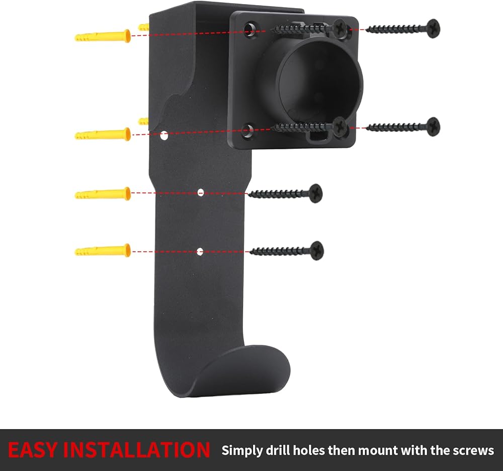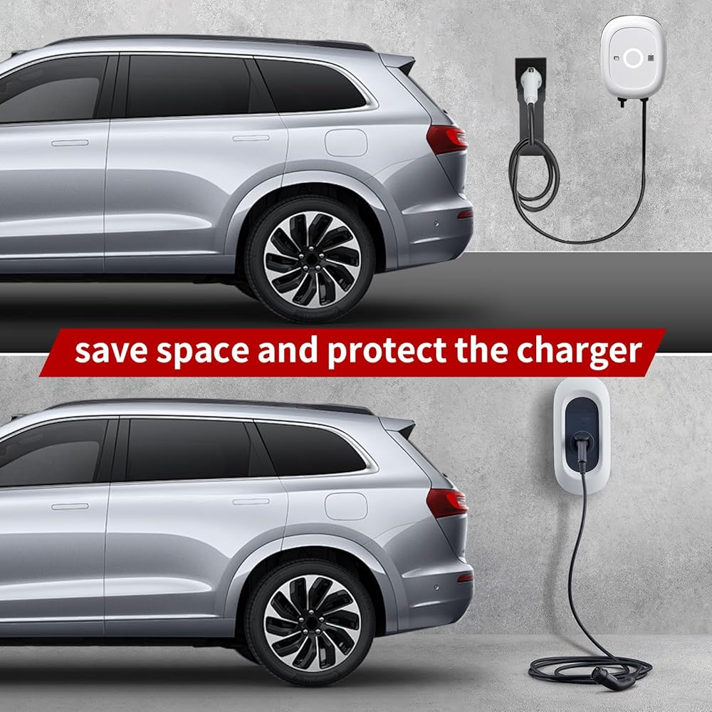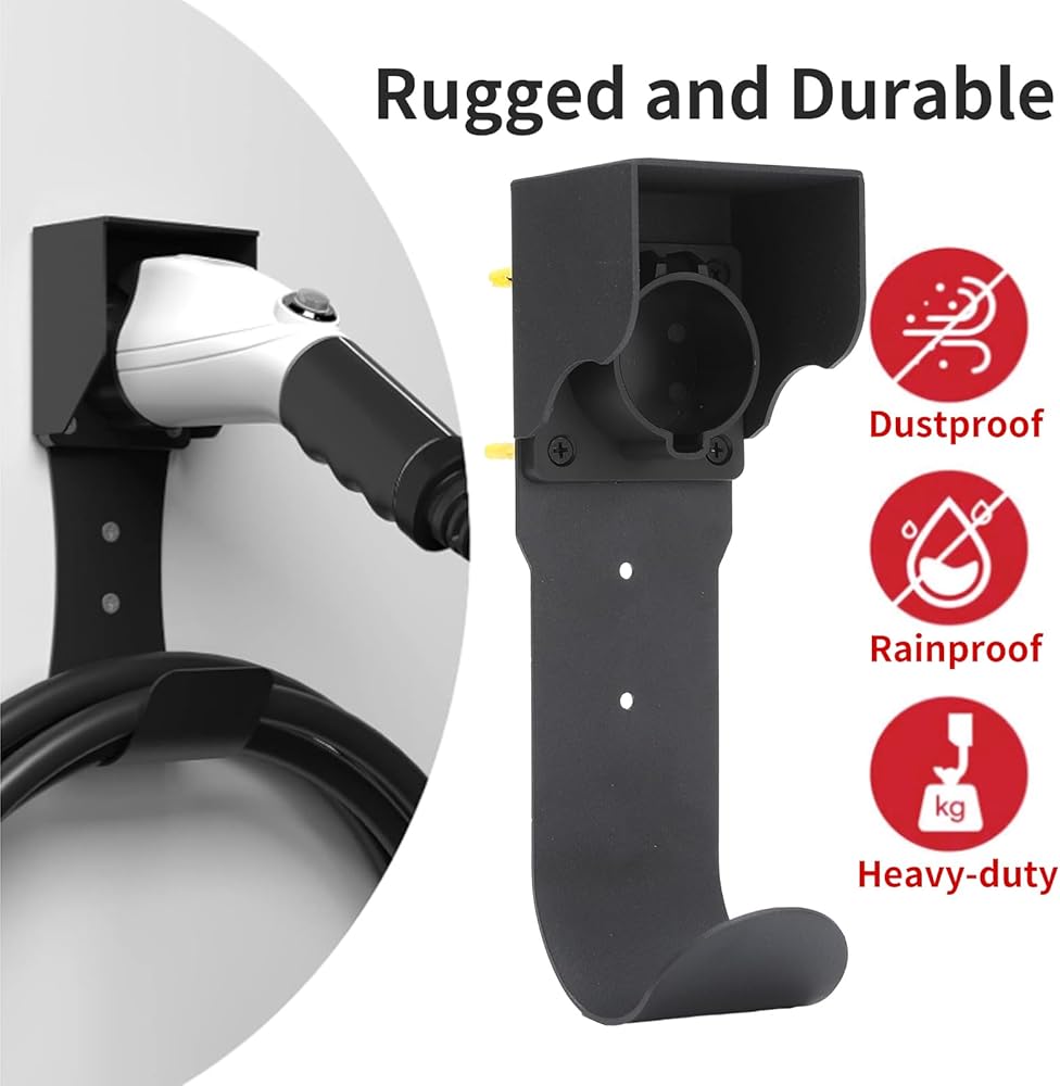• Easy Installation: The wall-mounted installation of the electric vehicle charger bracket comes with 1 J1772 base and U-shaped hook, along with 4 screws for easy installation.