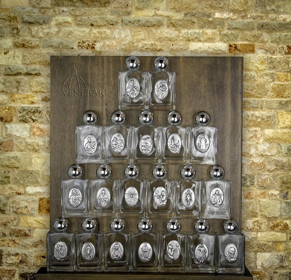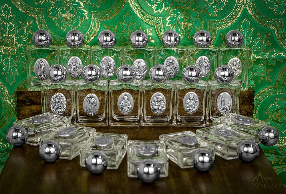 These precious holy water bottles are the perfect keepsake for your home altar or prayer space! Each bottle features a popular saint medallion and holds an ounce of holy water. Measures 3.25" x 1.5". Made in Italy.