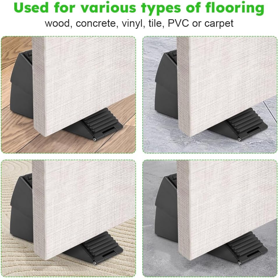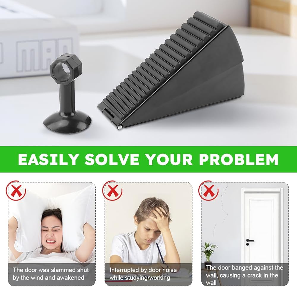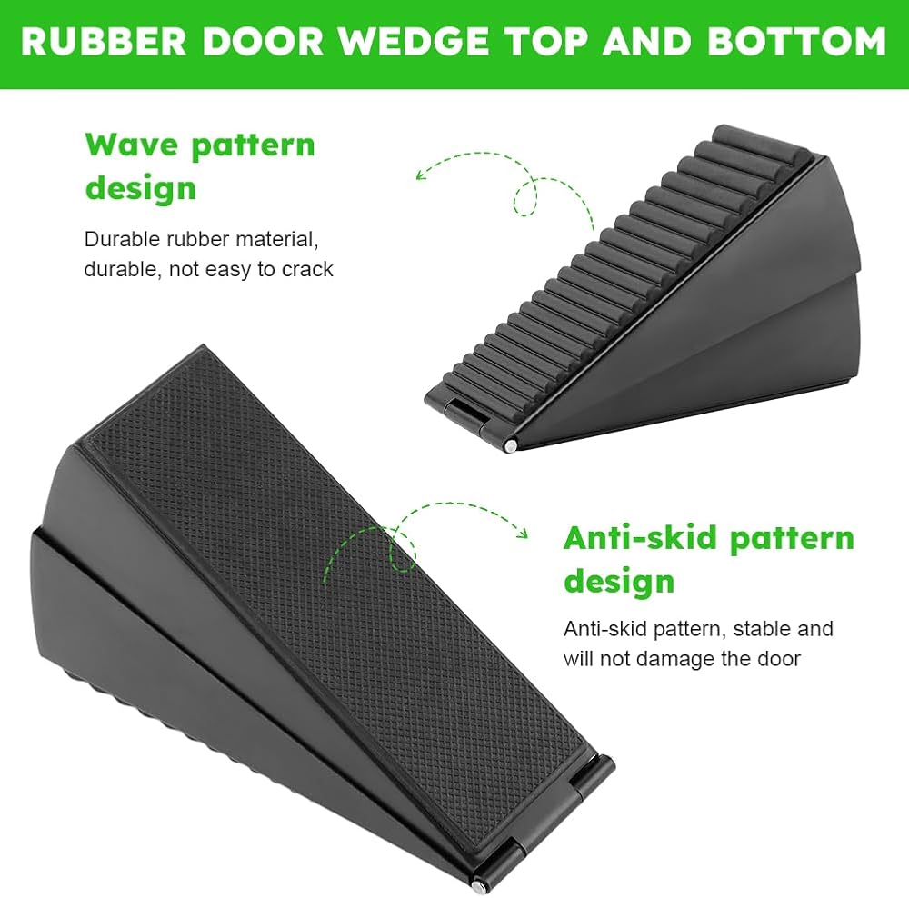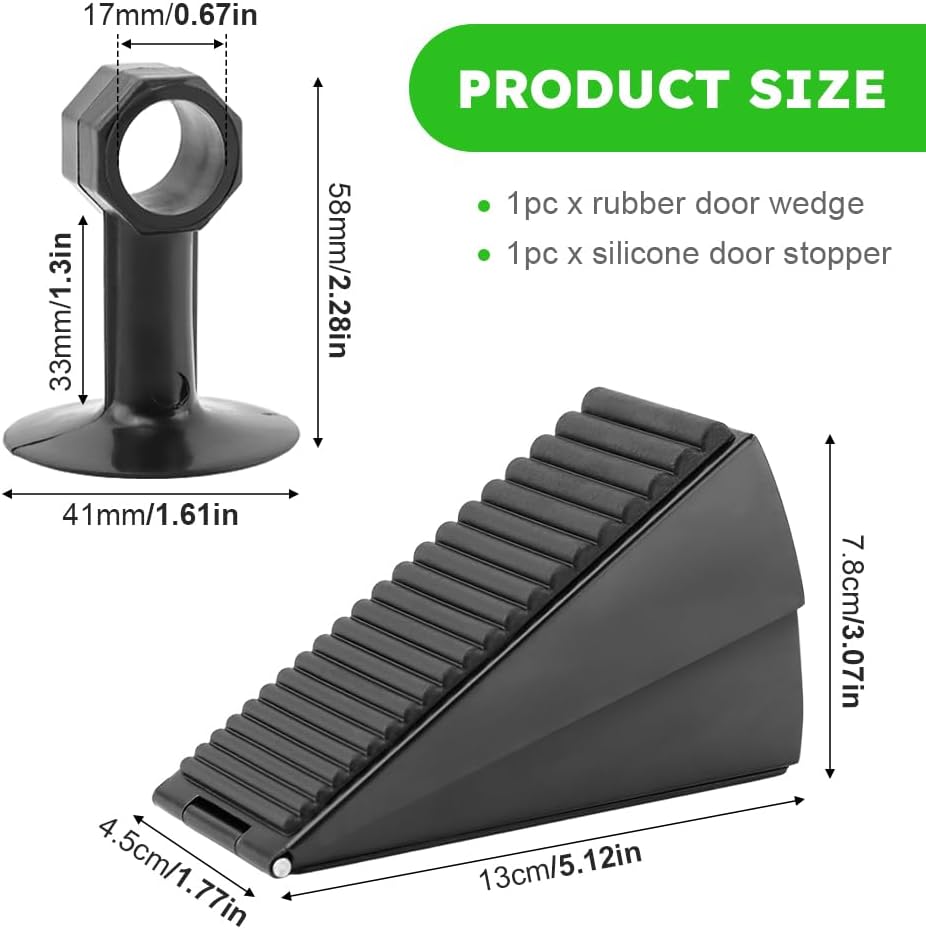 【DOOR STOPPER SET】You will get 1pc rubber door wedge,1pc silicone door stopper,rubber door wedge is suitable for door gaps with a height of 2-3inch,can reach up to 3 inches from the floor to the bottom of the door. And they can be used on a variety of different floors such as wood, concrete, vinyl, tile, PVC or carpet.