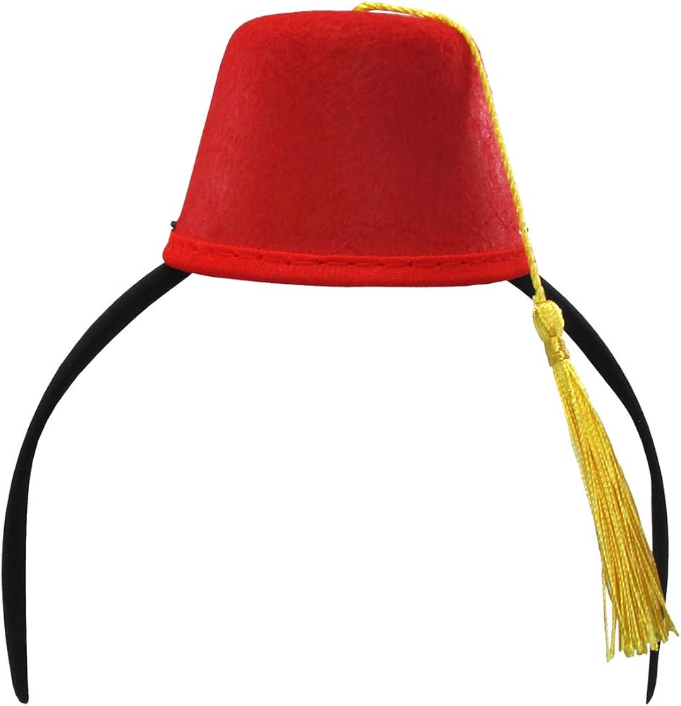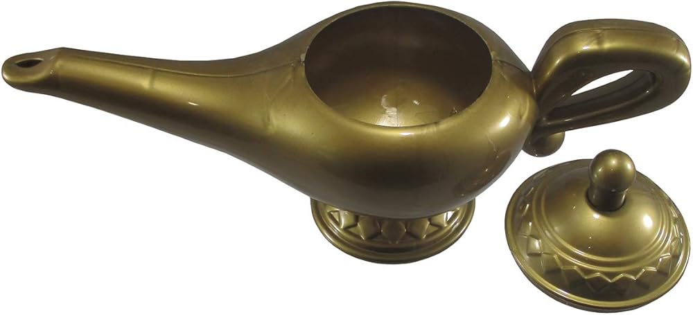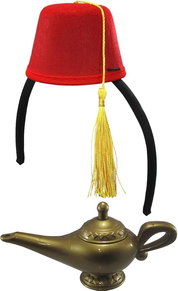 Nicky Bigs Novelties Magic Lamp and Fez Hat Headband Set Includes: Plastic Bronze Colored Lamp Made of Plastic and Mini Red Fez Hat with gold Tassel on a headband. The Lamp does open and the inside is hollow . Fun For Dress Up, Pretend Play, Costume, and Party Supplies. Lamp Size: 9"L X 5"H The hat measures approximately 3.5 inches in diameter and 2 inches tall. The tassel string is approximately 7 inches long Size: One Size Fits Most Adults For Ages 14 and Older