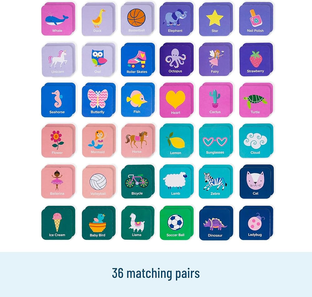 تصميم عالي الجودة - تتميز لعبة البلاط المطابقة لدينا بـ 72 بطاقة لعب متينة تعرض أعمالًا فنية مفعمة بالحيوية وآسرة مع الألعاب والمركبات والحيوانات المفضلة لدى الأطفال، وكلها مصممة مع وضع جماليات صديقة للأطفال في الاعتبار. تم تصميم هذه اللعبة التعليمية عالية الجودة للأولاد بدقة مع أخذ الأيدي الصغيرة في الاعتبار، وتتميز بألعاب بطاقات سهلة الفهم للأطفال وقواعد واضحة، مما يضمن ملاءمة الأطفال من سن 3 سنوات فما فوق.