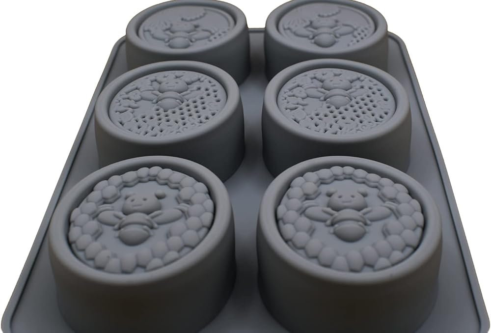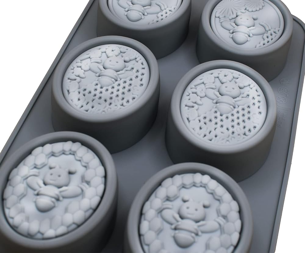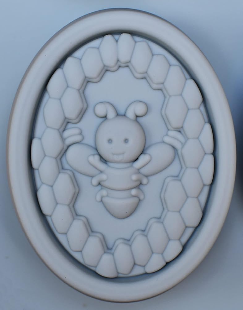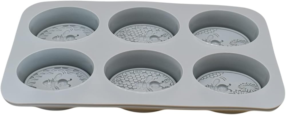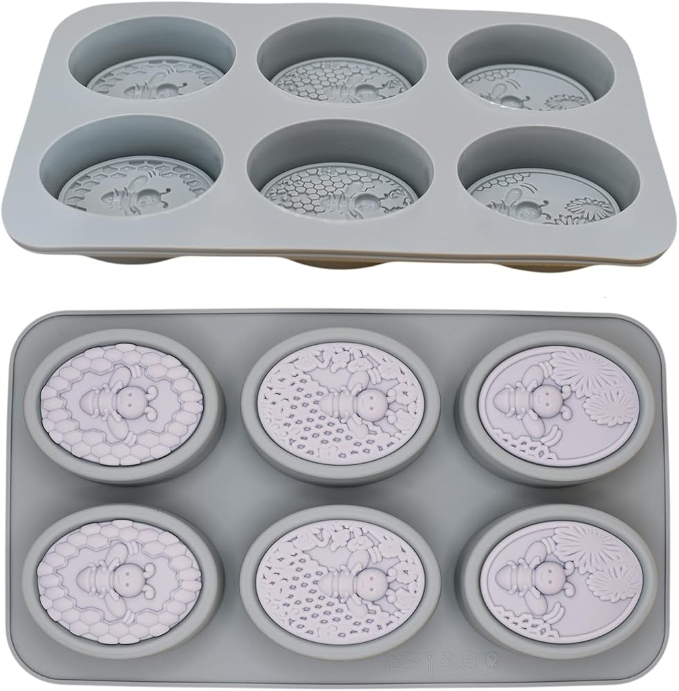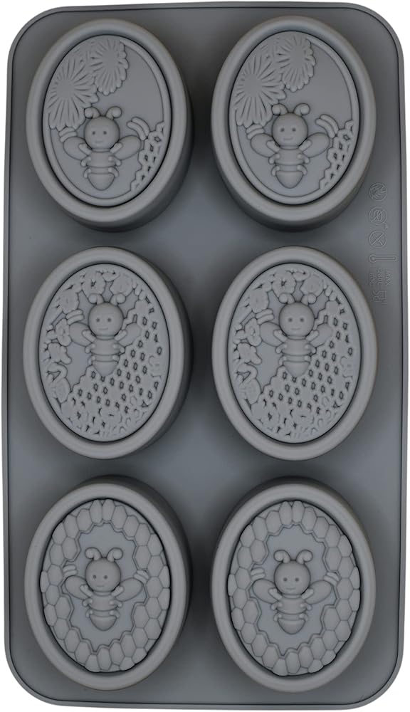 قالبان من السيليكون على شكل نحلة رمادية وقرص العسل لكل طلب. يبلغ مقاس كل قالب صابون النحل 27.94 × 16.25 سم وعمق 1.1 سم. يبلغ مقاس كل تجويف قالب نحل من السيليكون البيضاوي 3.1 × 2.35 وعمق 1.1 بوصة.