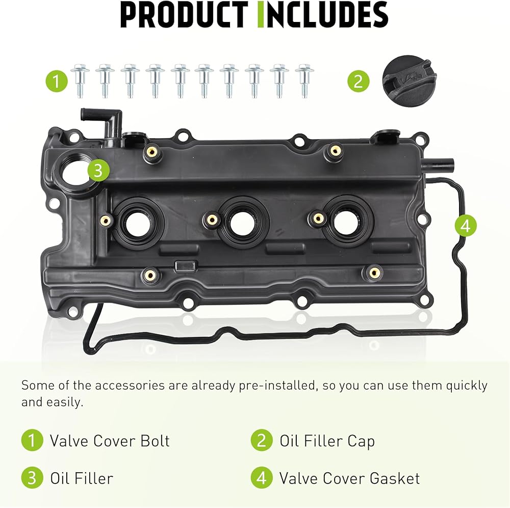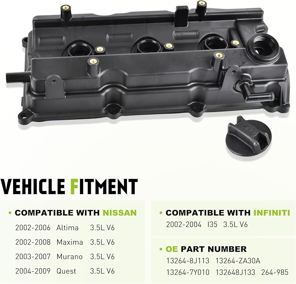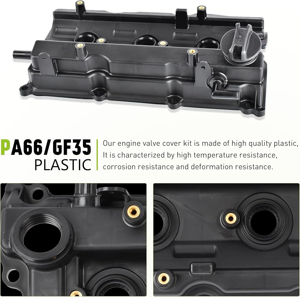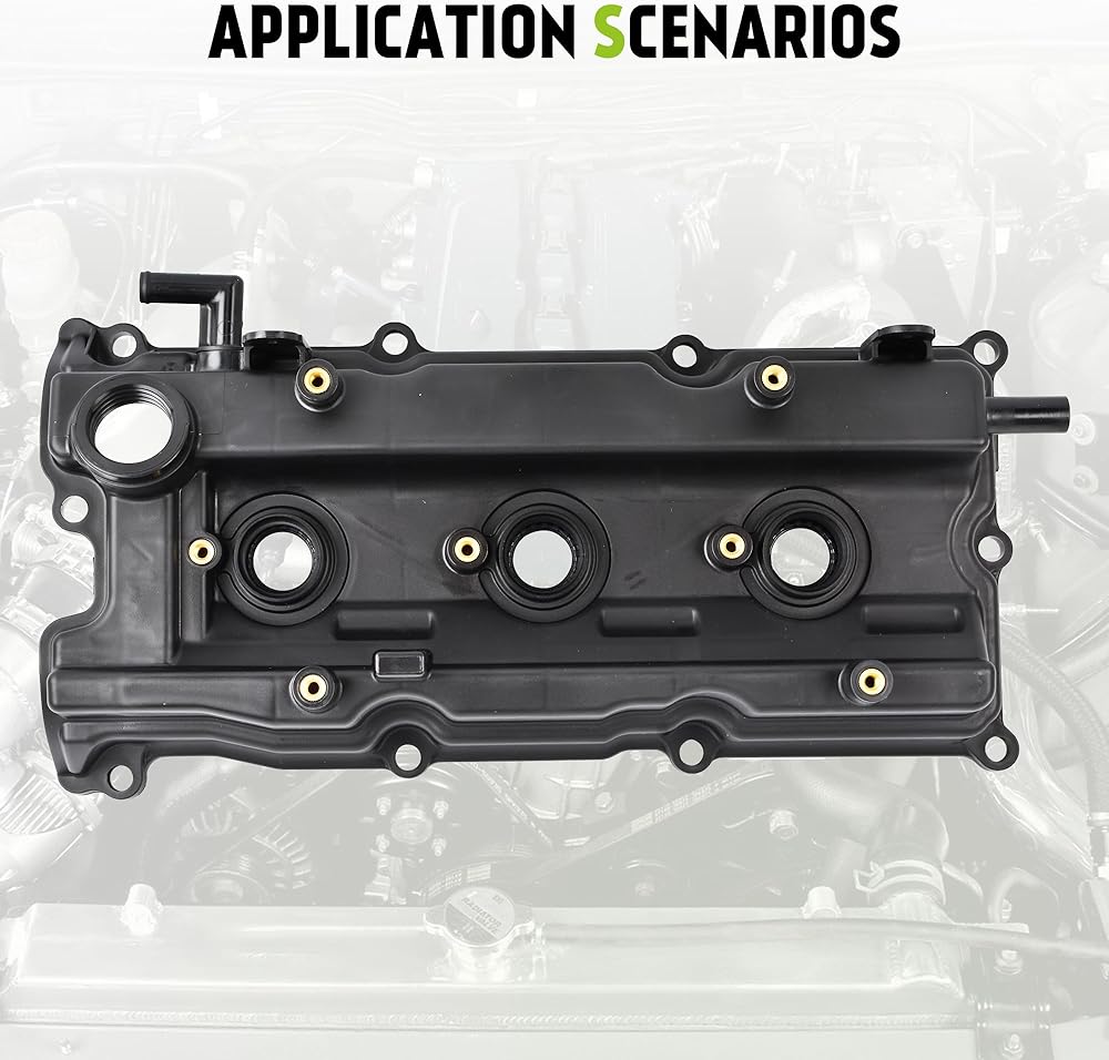 تركيب السيارة: مجموعة غلاف صمام المحرك متوافقة مع 2002-2006 Nissan Altima V6 3.5L ، 2002-2008 Maxima V6 3.5L ، 2004-2009 Quest V6 3.5L ، 2003-2007 Murano V6 3.5L ، 2002-2004 Infiniti I35 V6 3.5L محرك