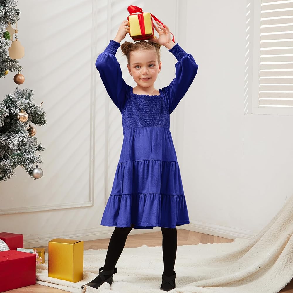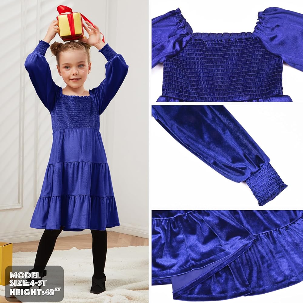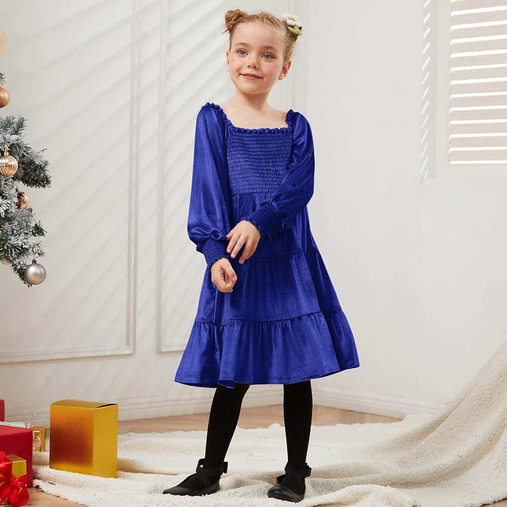 - فساتين مخملية سموكد للفتيات، أكمام طويلة، حافة كشكش، طول الركبة