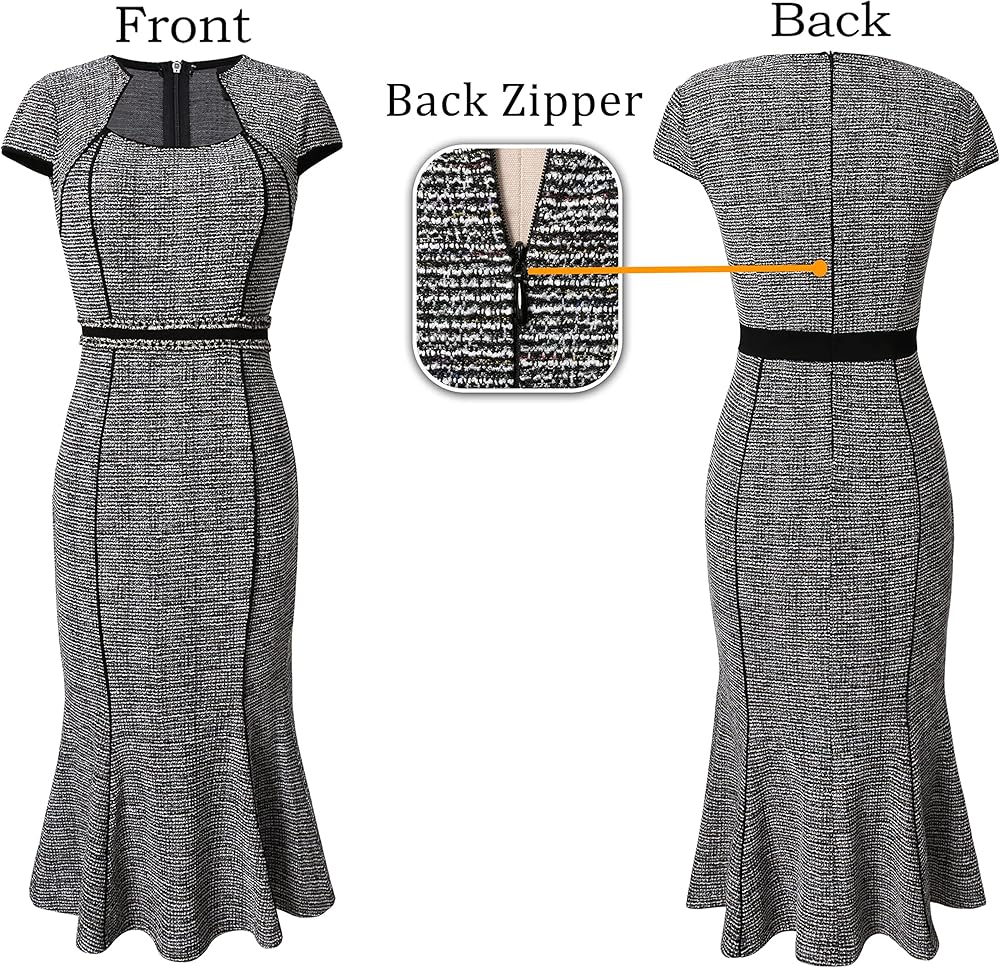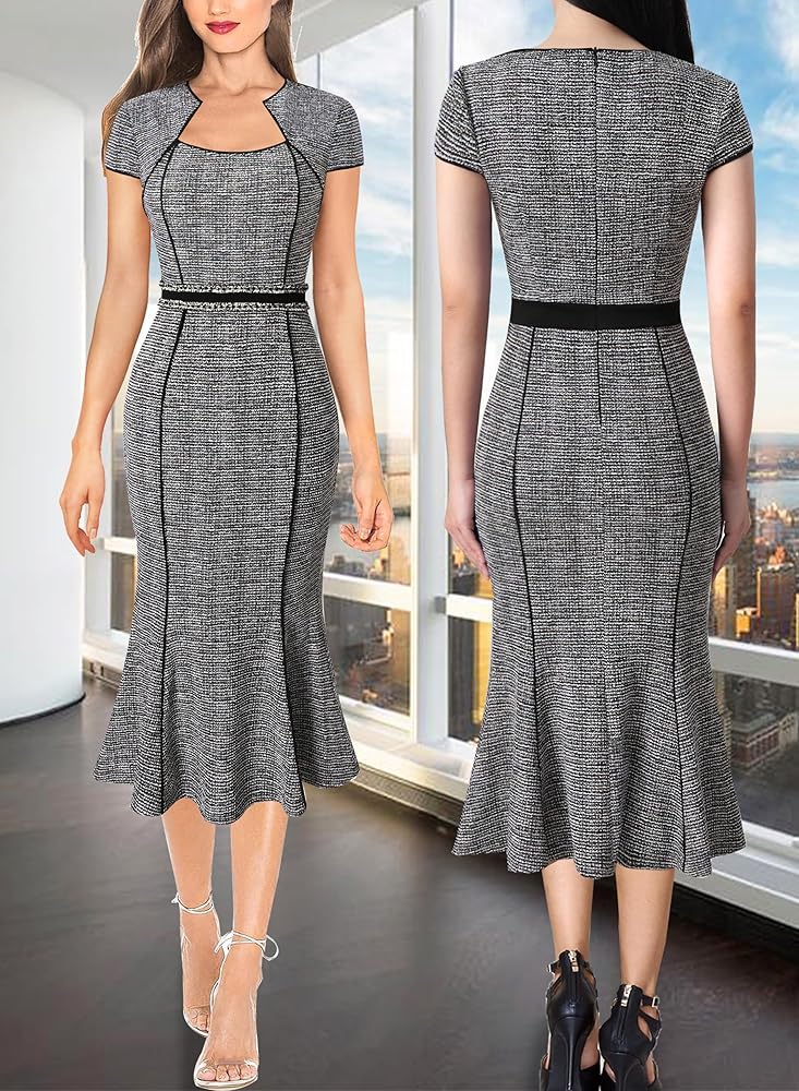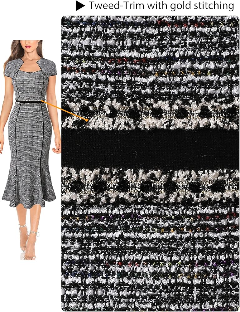 النمط: أكمام قصيرة، تفاصيل حاشية حورية البحر، تصميم خصر من التويد مع خياطة معدنية، تصميم مرقع، أشرطة ملونة تخلق تأثيرًا نحيفًا، صورة ظلية غمد حورية البحر، طول متوسط، سحاب خلفي مخفي.
