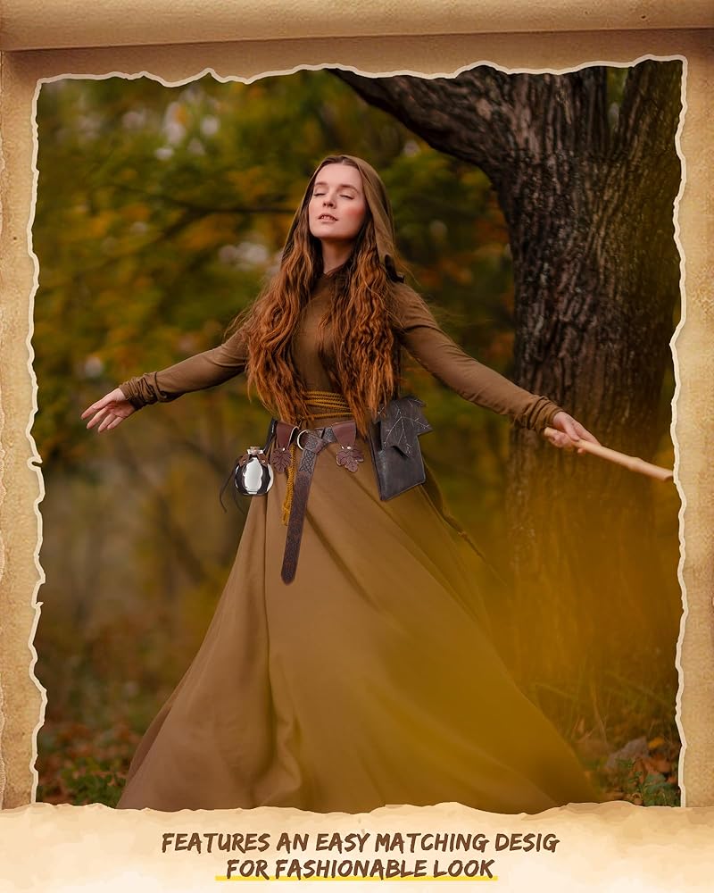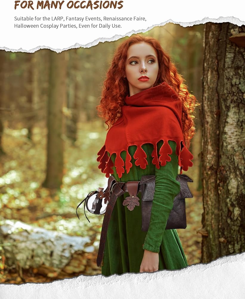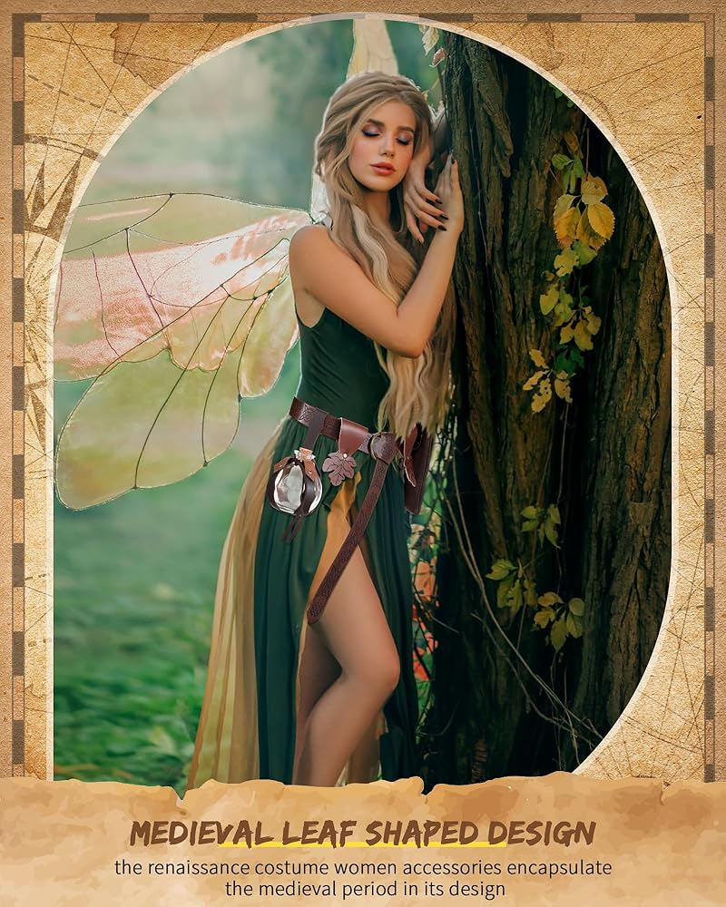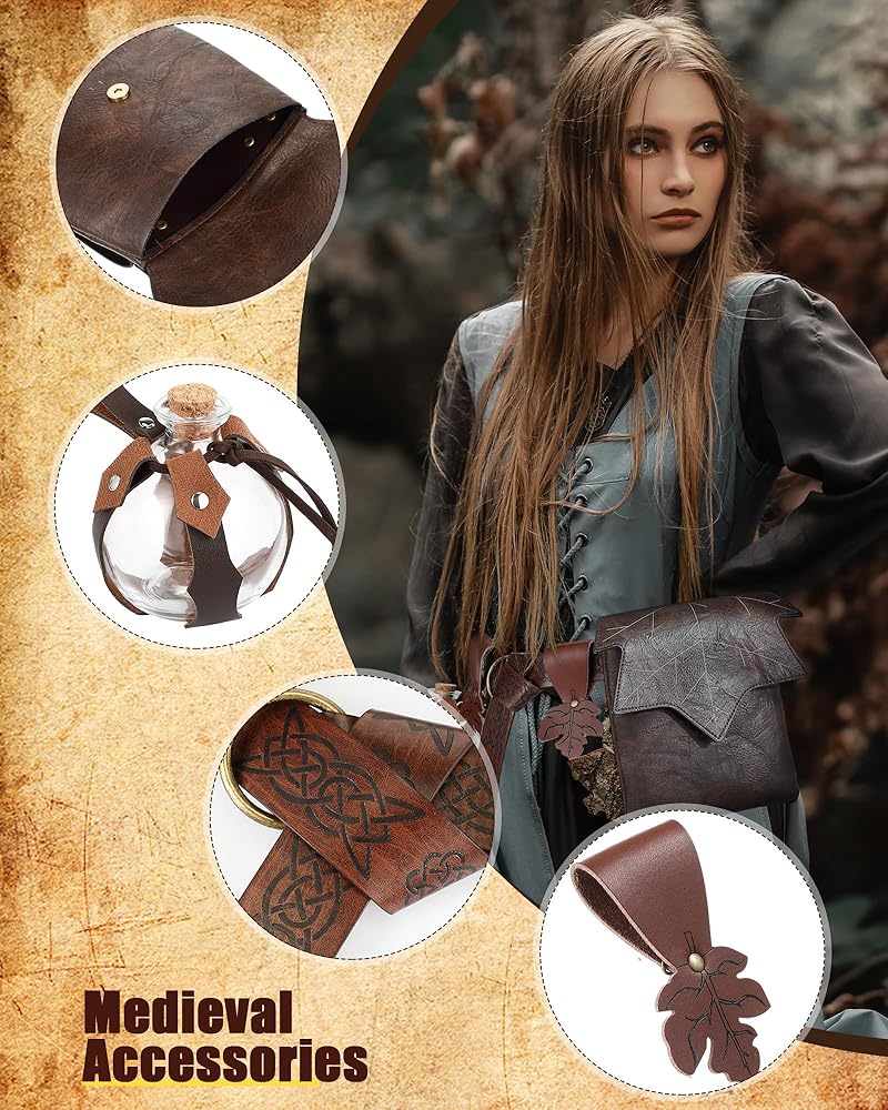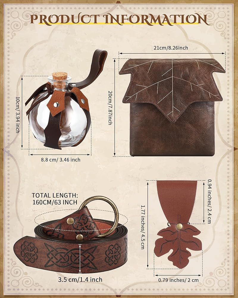 Halloween Costume Accessories: the set includes 1 glossy leather medieval belt, 1 leaf belt pouch, 1 potion bottle with cork, 1 carry strap, and 2 maple leaves skirt hikes; Each piece boasts a uniform size, in line with modern aesthetics