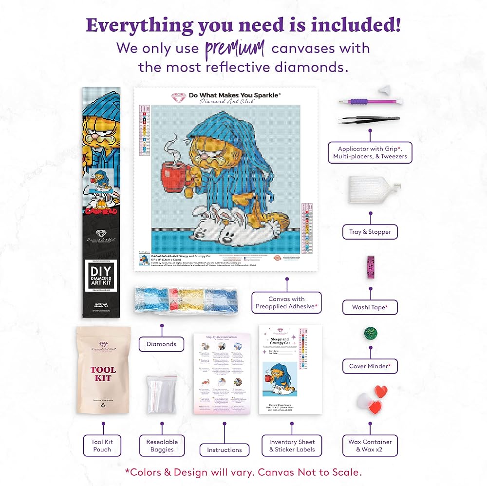 INCLUDED: A 9" x 9" (22.8cm x 22.8cm) full-drill canvas, round diamonds in 25 colors with 3 aurora borealis diamonds and 3 fairy dust diamonds, twist & pick applicator with putty and multiplacers, stackable tray with lid and stopper, inventory sheet with pre-cut sticker labels, and resealable baggies.Diamond count: 6,889.