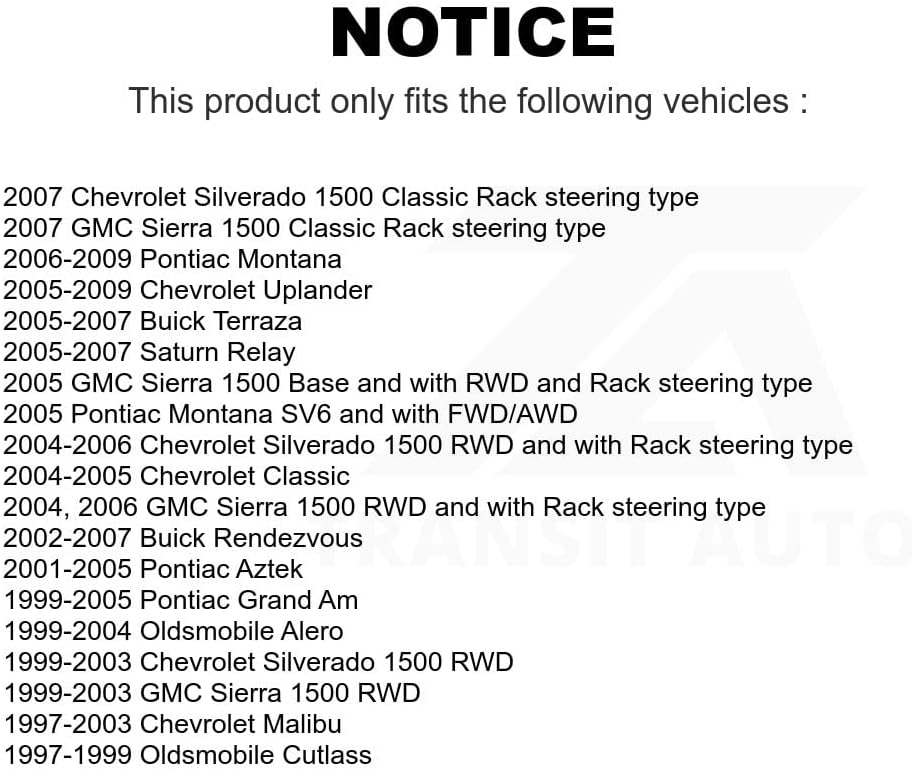 Replacement for: [Front Outer] 2007 Chevrolet Silverado 1500 Classic (Rack steering type), 2007 GMC Sierra 1500 Classic (Rack steering type), 2006-2009 Pontiac Montana, 2005-2009 Chevrolet Uplander, 2005-2007 Buick Terraza, 2005-2007 Saturn Relay, 2005 GMC Sierra 1500 (Base and with RWD and Rack steering type), 2005 Pontiac Montana (SV6 and with FWD/AWD), 2004-2006 Chevrolet Silverado 1500 (RWD and with Rack steering type), 2004-2005 Chevrolet Classic, 2004, 2006 GMC Sierra 1500 (RWD and with Rack steering type), 2002-2007 Buick Rendezvous, 2001-2005 Pontiac Aztek, 1999-2005 Pontiac Grand Am, 1999-2004 Oldsmobile Alero, 1999-2003 Chevrolet Silverado 1500 (RWD) and more...