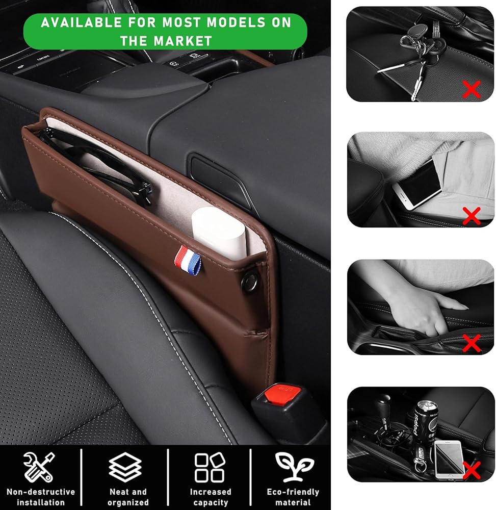 • 【Easy to Install & Clean】: Storage box for car seat gap adopts a plug-and-play design, easy to install and use in your car. You just need to slip it into the gaps between your front seat and middle console. Due to its waterproof performance, it is also easy to clean, and you can merely wipe it with a wet towel or wet tissue.
