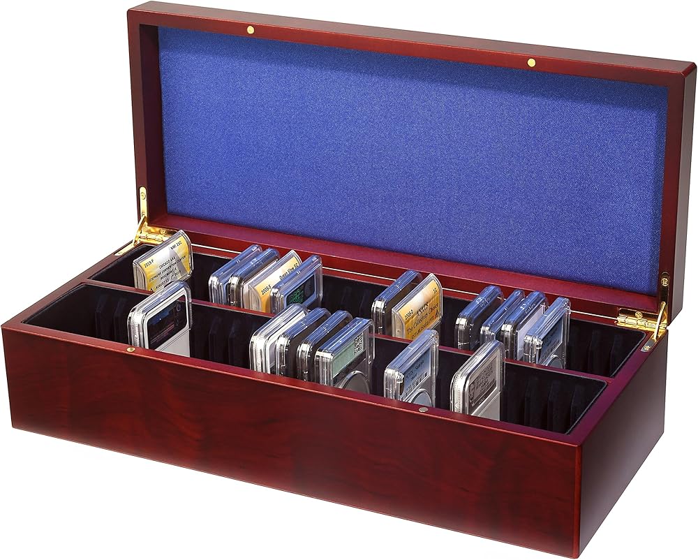 Elegant and space-saving: compact 50-slab box in mahogany wood grain finish with silk lined lid. Molded insert covered in soft dark-blue velour. Suitable for most certified coin holders (PCGS, NGC, ANACS, ICG, etc.). Solid construction, gold-plated hinges, secure magnetic closure. Overall size: 14 5/8 x 6 1/4 x 3 7/8" (373 x 83 x 98mm).