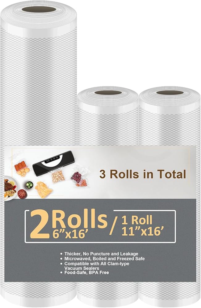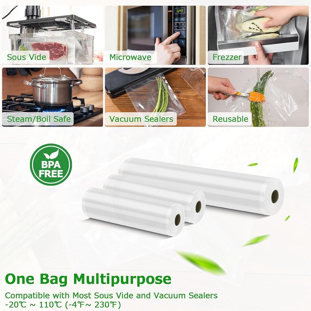 المتانة: أكياس الفريزر بتفريغ الهواء خالية من البيسفينول أ وآمنة على الطعام، مثالية لتخزين الطعام والتجميد والغليان. آمنة للاستخدام في الفريزر والثلاجة والميكروويف والسو. لفات أكياس حفظ الطعام بتفريغ الهواء تمنع الثقب والتمزق.