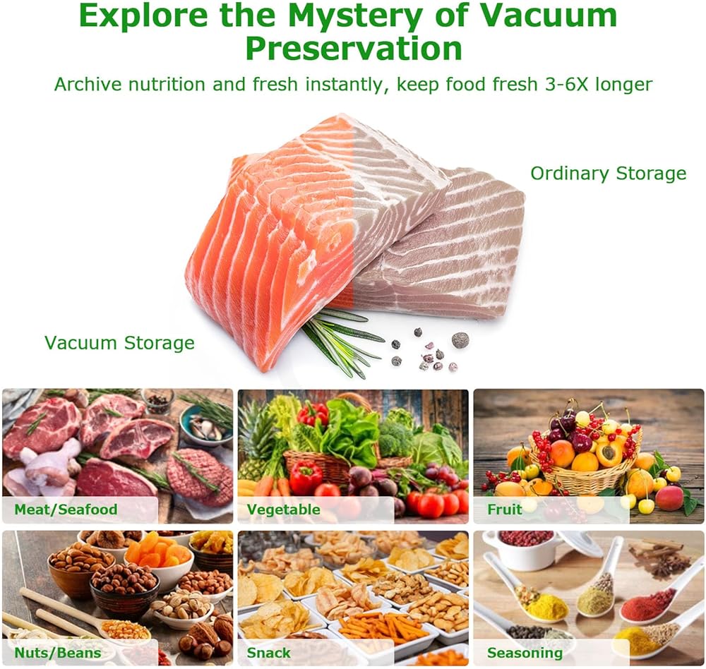 النضارة: تعمل لفات أكياس الإغلاق بتفريغ الهواء على إطالة العمر الافتراضي 3-6 مرات، وتحافظ على النضارة والمغذيات والنكهة، وتحجب الأكسجين والرطوبة، وتحافظ على اللحم البقري واللحوم والأسماك والدجاج طرية ولذيذة، وتقلل الخضروات والفواكه الشجاعة والذبولة. لا يحترق المجمد.