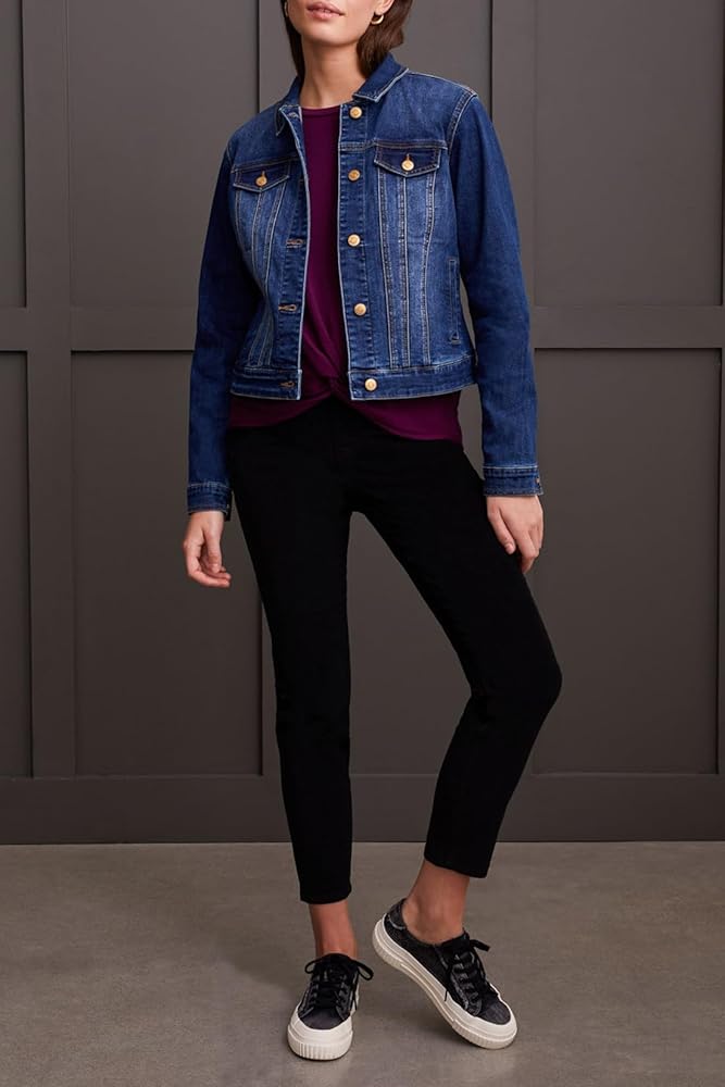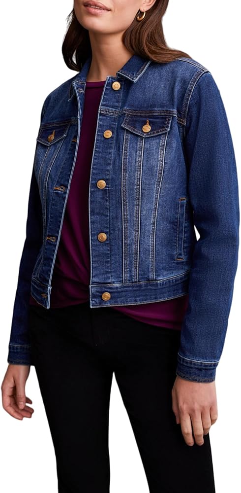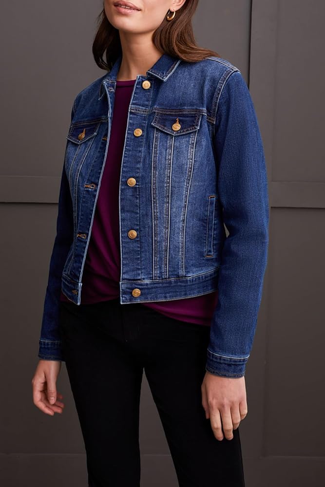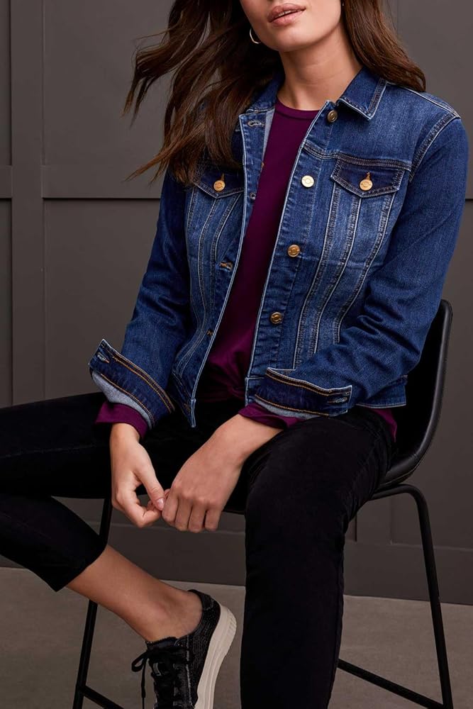 Embrace timeless style with this classic denim jacket, characterized by its button-up front and shirt collar neckline. Practical side welt pockets offer everyday functionality, while decorative chest pockets maintain a traditional aesthetic without adding bulk. Plus, customize the fit to perfection with the adjustable back tabs, ensuring a silhouette that flatters your unique shape.