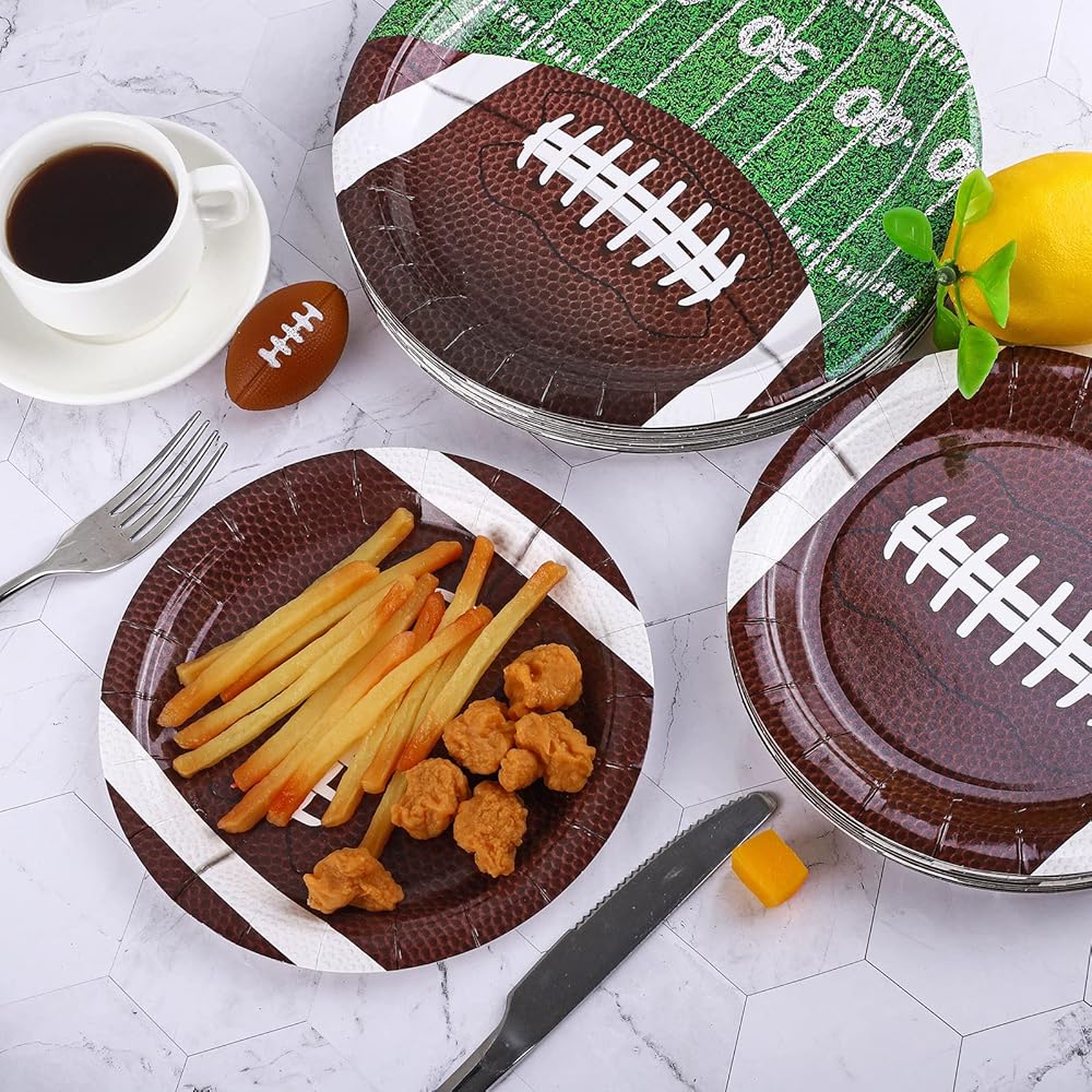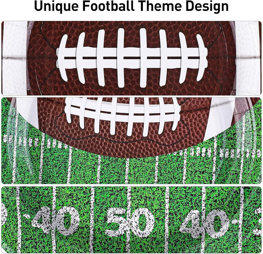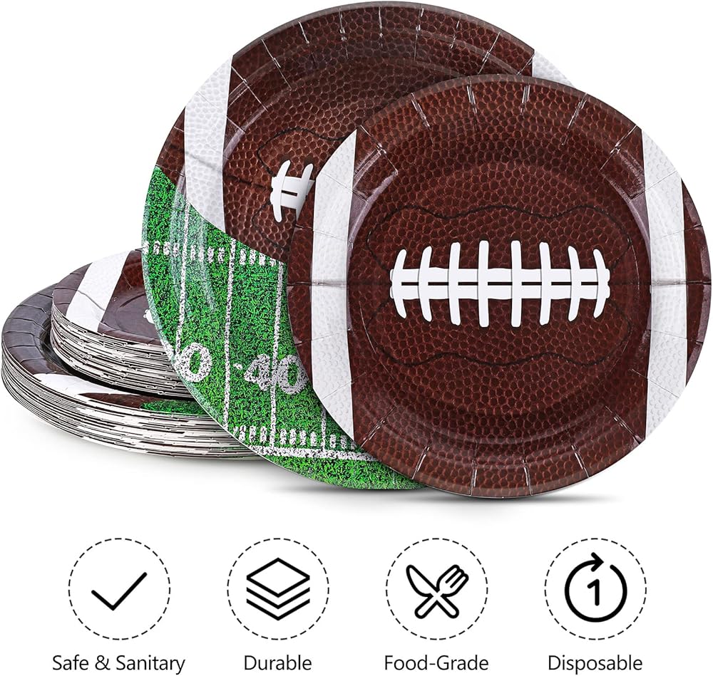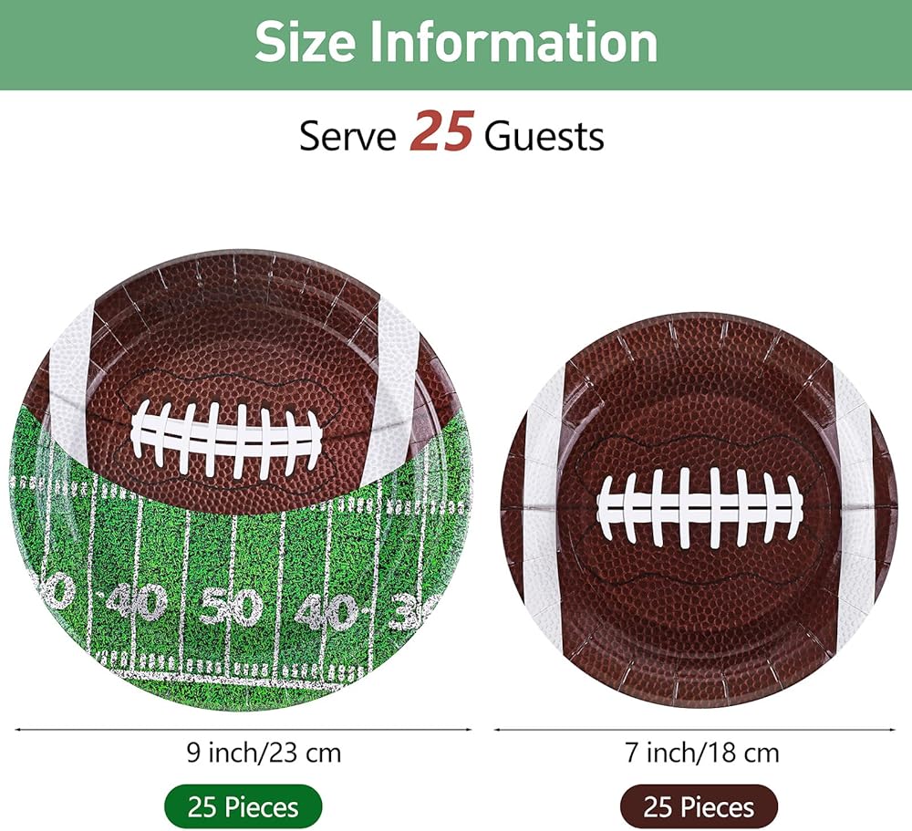 مجموعة أدوات مائدة من Durony 50 قطعة لحفلات كرة القدم، أطباق ورقية مستديرة للاستعمال مرة واحدة لحفلات كرة القدم الرياضية وديكورات يوم ألعاب Super Bowl مقاس 7 بوصات و9 بوصات بتصميمين