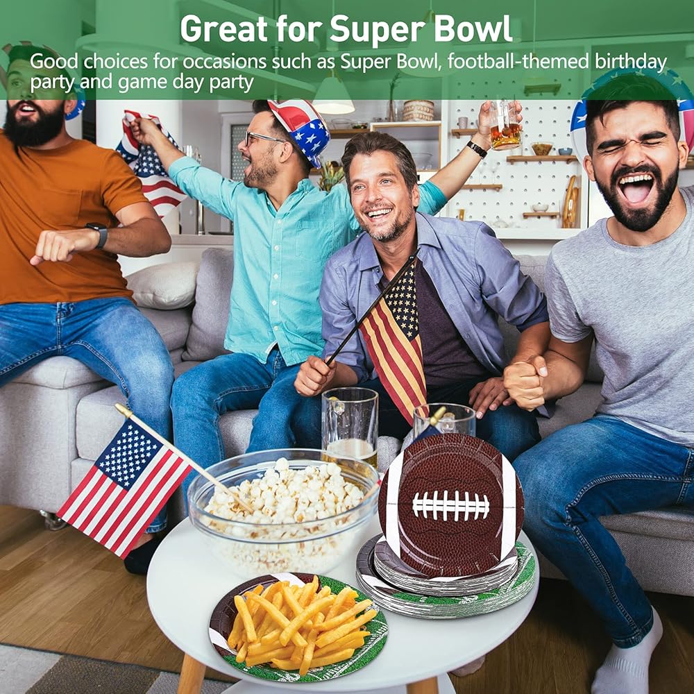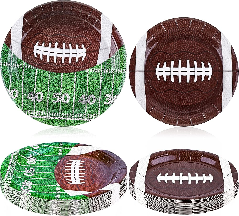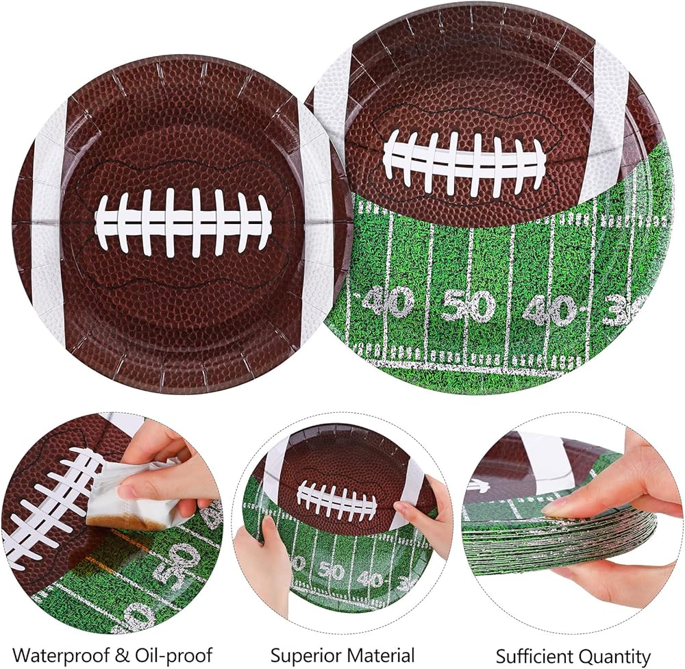 مجموعة أدوات مائدة من Durony 50 قطعة لحفلات كرة القدم، أطباق ورقية مستديرة للاستعمال مرة واحدة لحفلات كرة القدم الرياضية وديكورات يوم ألعاب Super Bowl مقاس 7 بوصات و9 بوصات بتصميمين