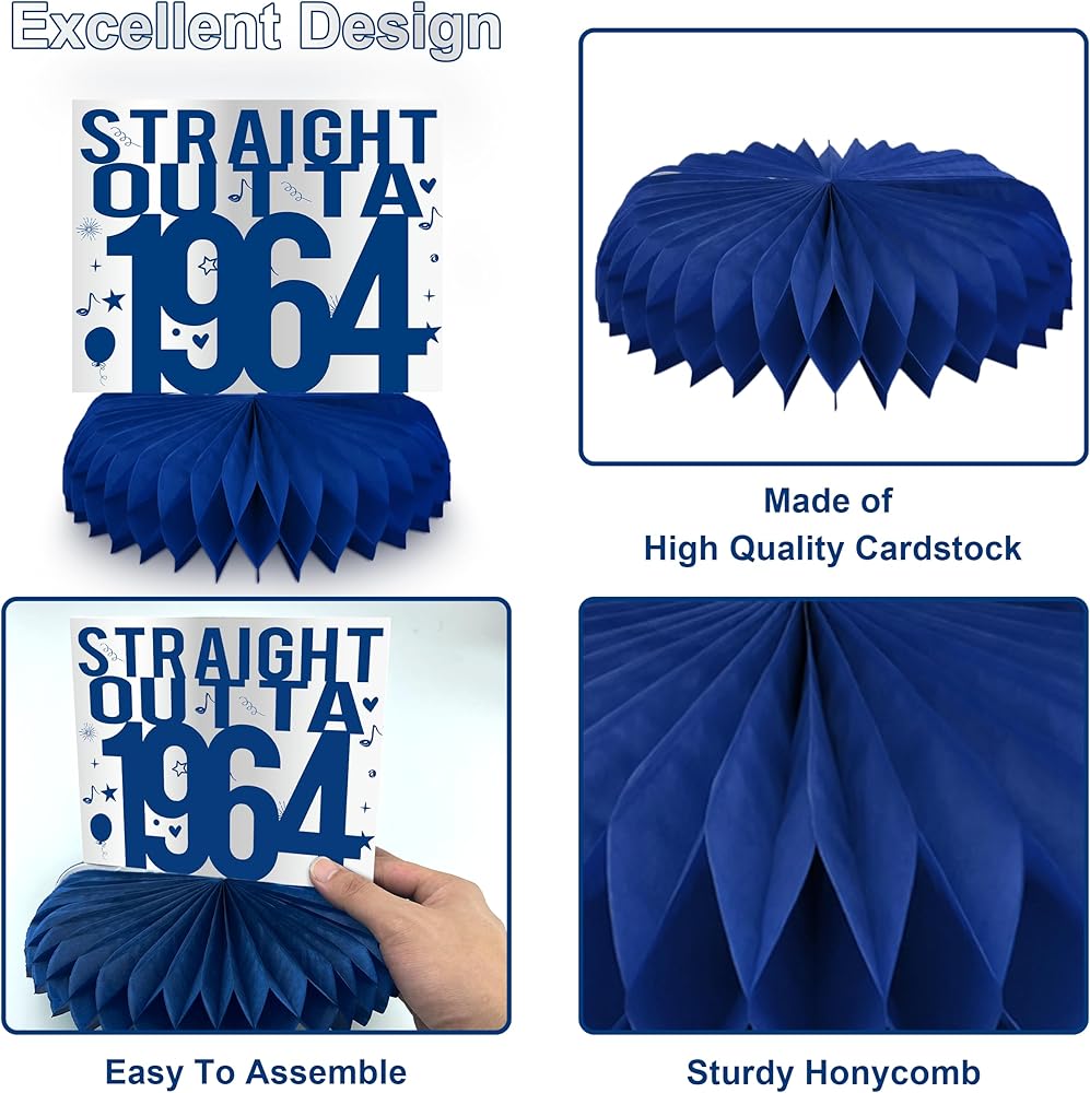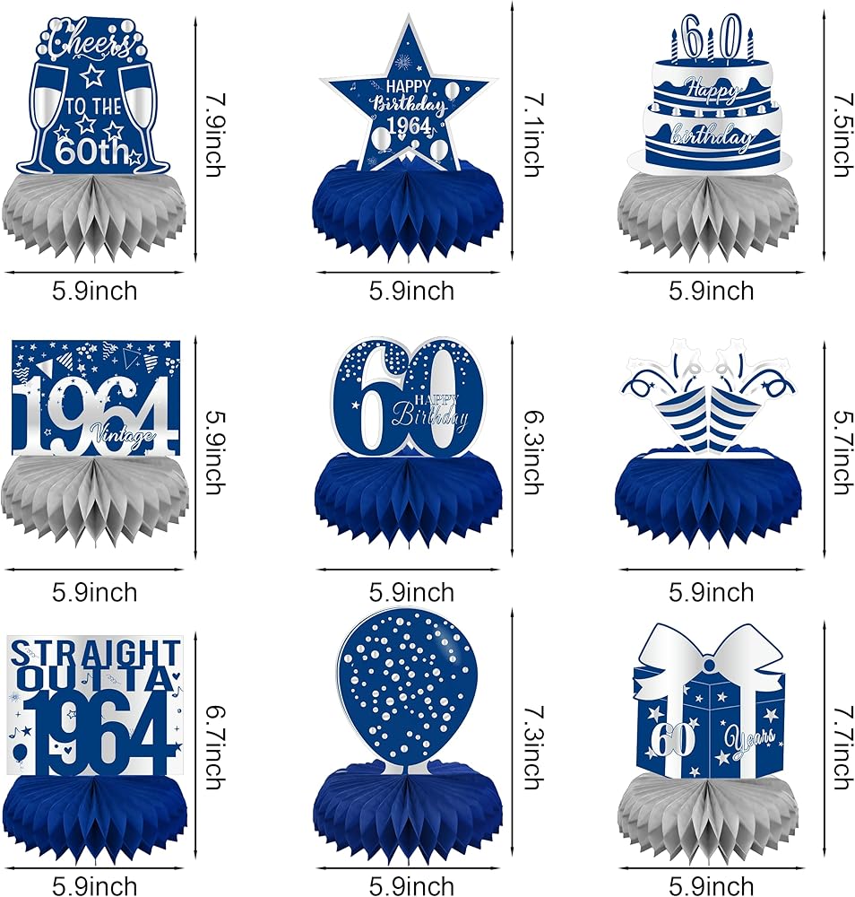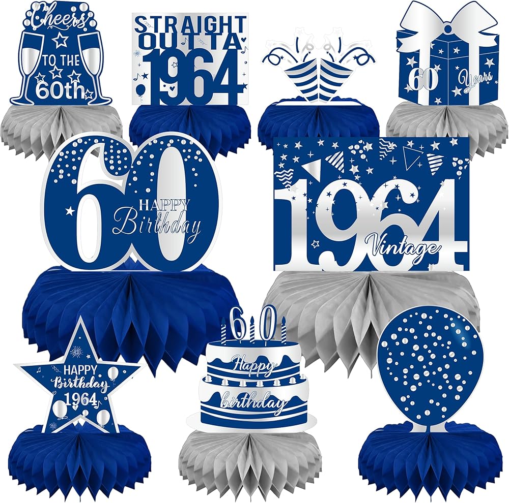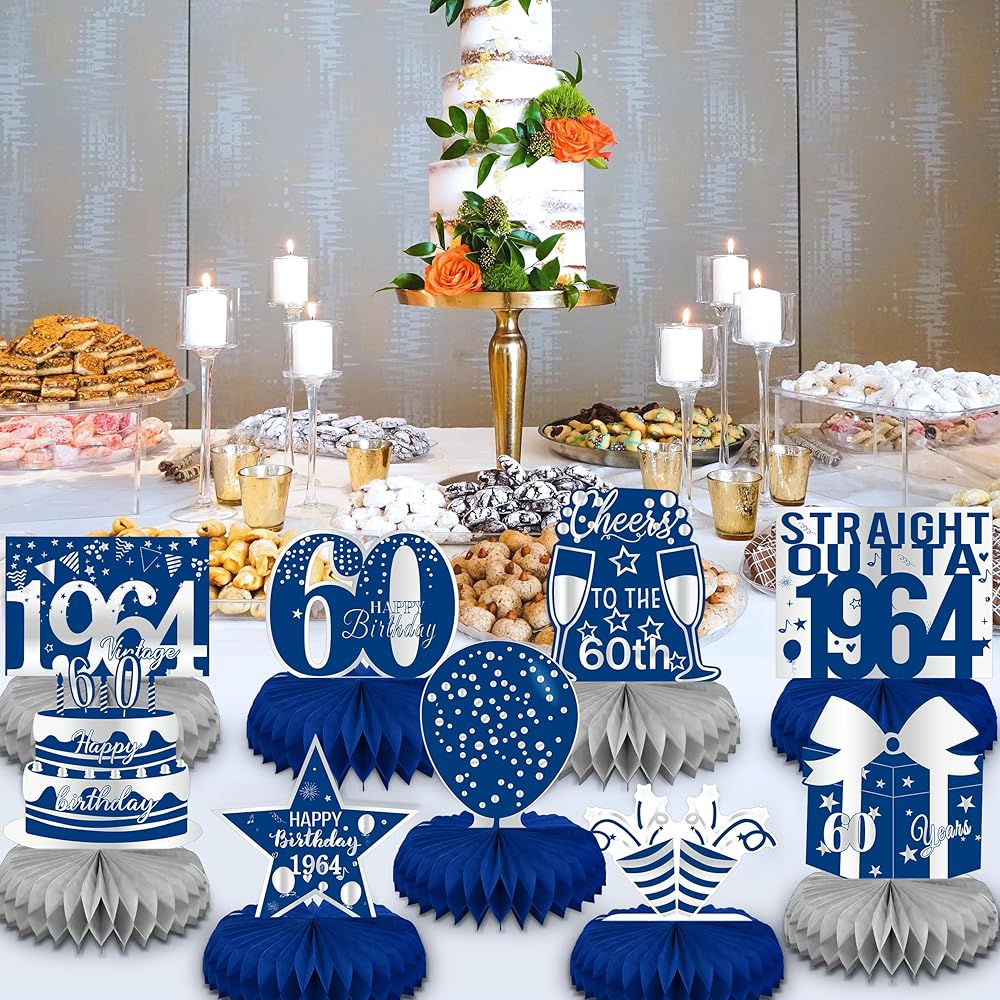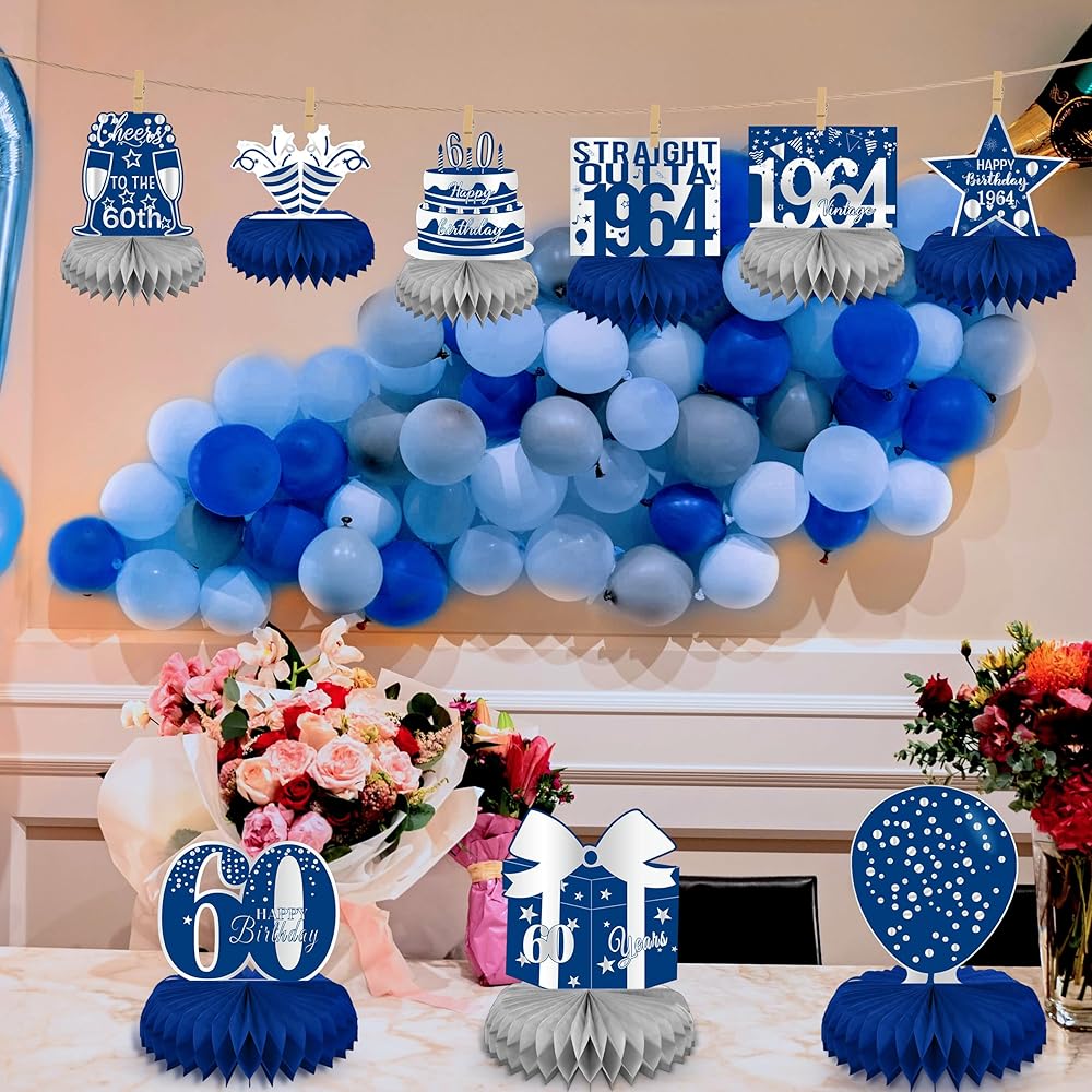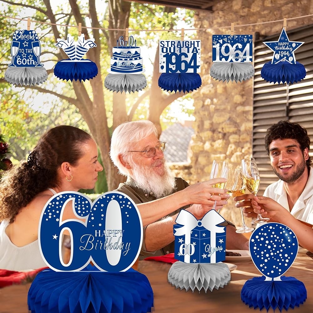 linaye زينة عيد الميلاد الستين للرجال - قطع مركزية على شكل قرص العسل باللونين الأزرق والفضي لحفلة عيد ميلاد تبلغ من العمر 60 عامًا قطع مركزية لعيد الميلاد الستين لطاولة ديكور ديكور عتيق لعيد الميلاد الستين
