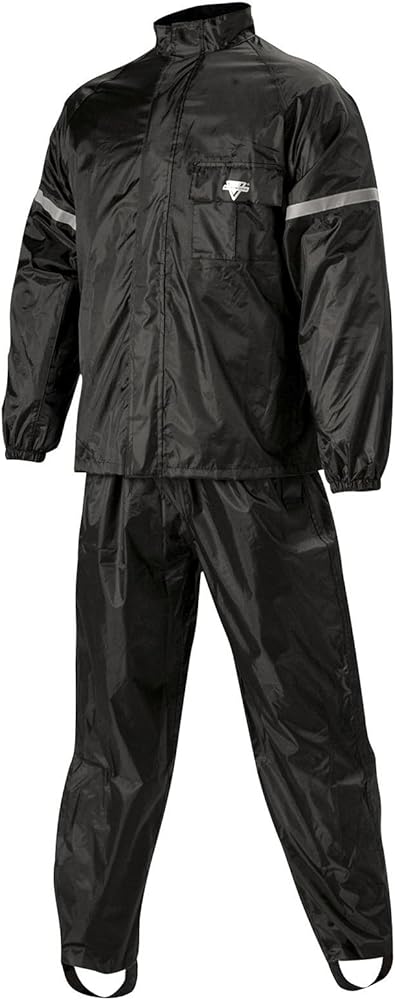 Two-piece 100% waterproof motorcycle rain suit. Soft Polyester outer shell with PVC backing. Jacket has full-length zipper with Self-fastening storm flap. Outer waterproof chest pocket. Elasticized cuff and waist. Reflective striping for night visibility. Pants feature ankle gussets for easy boot entry. Rain suit is covered by an exclusive 2-year warranty.