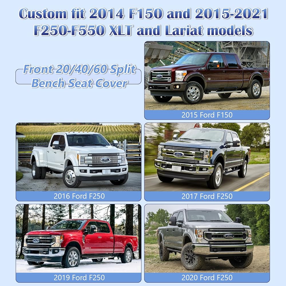 【ملاءمة تامة】أغطية المقاعد تناسب تمامًا موديلات 2014 F150 و2015-2021 F250-F550 XLT وLariat. تم تصميم مجموعة غطاء المقعد الأمامي المقسمة 40/20/40 لتناسب الطراز المحدد فقط (F486 C8 2014 Ford F150 و2015-2021 Ford F250؛ F350، F450، F550 XLT وLariat).