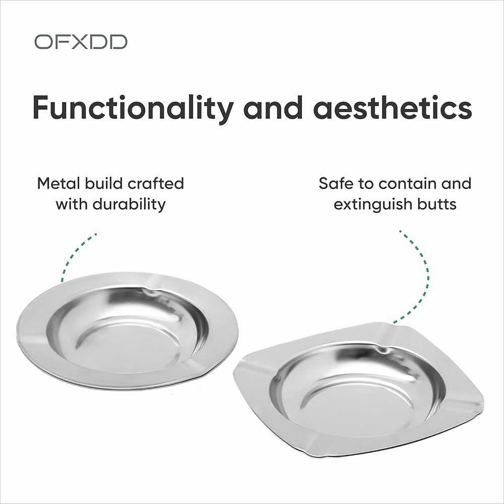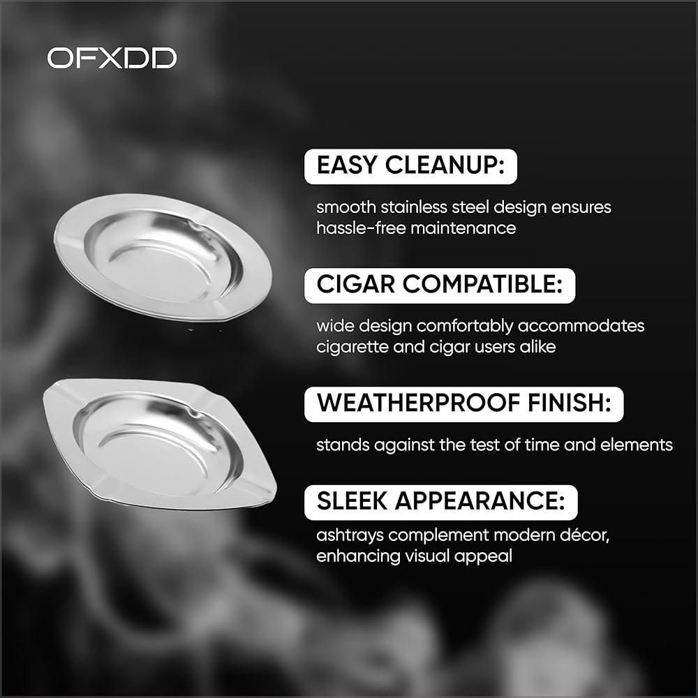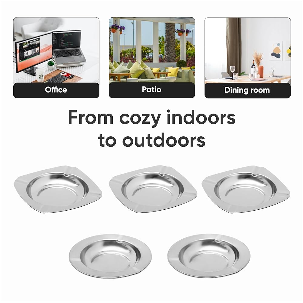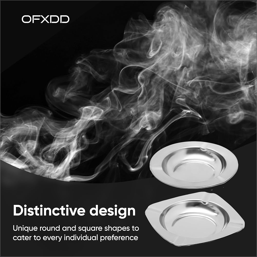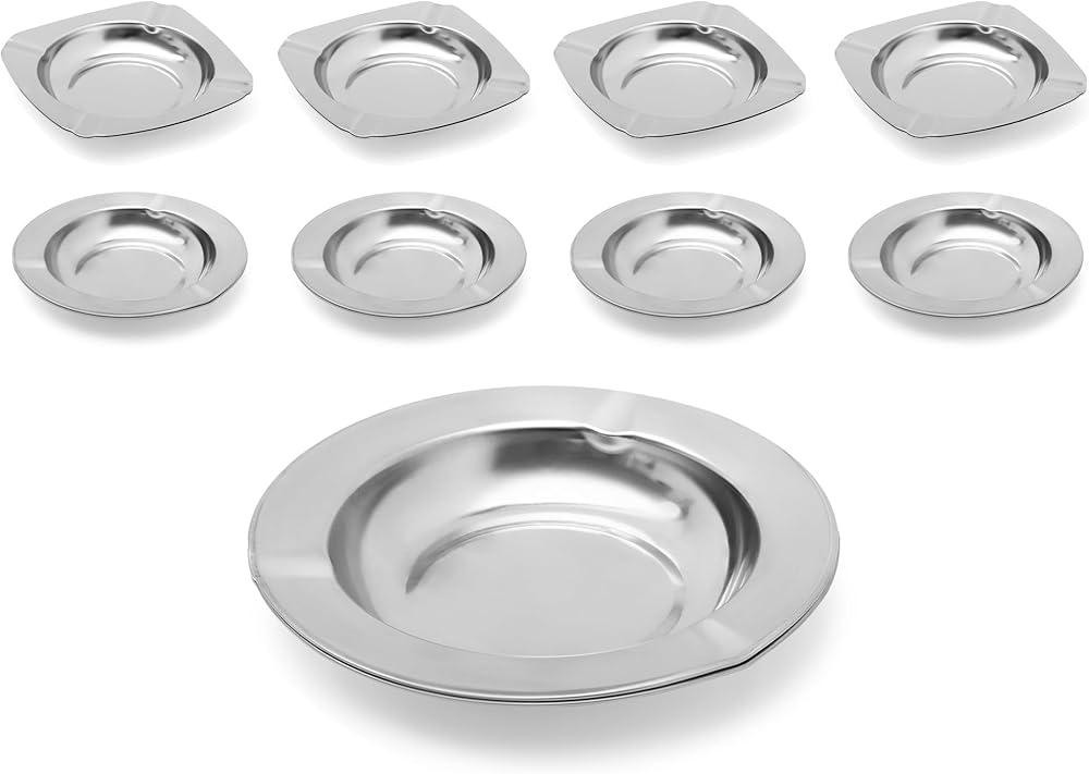 With the ashtray 9-piece set, you may achieve a new degree of refinement. This collection, meticulously crafted, flawlessly combines design and usefulness. These ashtrays are the perfect statement pieces for your smoking area, designed for both indoor and outdoor use. With 5 round ashtrays (4.72 inch) and 4 square ashtrays (4.33x4.33 inch), this collection provides a variety of options to meet your needs. Each ashtray is painstakingly manufactured from superior stainless steel and features a polished finish that adds a sense of elegance to your environment. Our ashtrays are designed to meet your needs, whether you're smoking alone indoors or having a gathering on your patio. The tight notches keep your smokes secure, and the deep reservoirs easily contain ash, guaranteeing a clean environment. When the ashtray is not in use, the detachable lid adds a layer of convenience by keeping odors contained. The stainless steel construction makes cleaning and upkeep a snap. Every smoking experience should be a celebration of style and function. Ashtrays are more than just decorative items; they are conversation starters and works of art that improve your home and generate memorable moments. Why settle for the ordinary when you may have the extraordinary? Choose the ashtray 9-piece set to upgrade your smoking area. Add your cart now and enjoy smoking luxury like you've never experienced before.