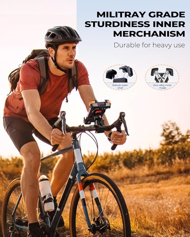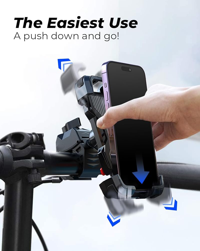 【تشغيل وإيقاف الهاتف مرة واحدة】استخدام بيد واحدة، اضغط لأسفل وانطلق. كما أن حامل هاتف الدراجة لن يغطي مستشعر التعرف على الوجه، مما يسمح لك برؤية كل بوصة من الشاشة. قابل للتعديل بمقدار 360 درجة، يمكنك تعديله حسب الزاوية الأكثر ملائمة لك.