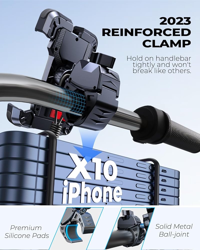 【مصمم ليكون صلبًا】تم تحسين مشبك المقود الخاص بحامل هاتف الدراجة النارية هذا بالكامل. قوي للغاية مع معدن مدمج في المفصل الكروي، قوي لمقاومة الضغط الصناعي من الدرجة 10+، لذلك لن ينكسر مثل الآخرين. مع بطانة السيليكون الممتازة، لن ينزلق المشبك على المقاود عند الاصطدام بالصدمات، بينما يحمي أيضًا لوحة المقود الخاصة بك.!!! متوافق مع المقود من 0.5 بوصة إلى 1.69 بوصة