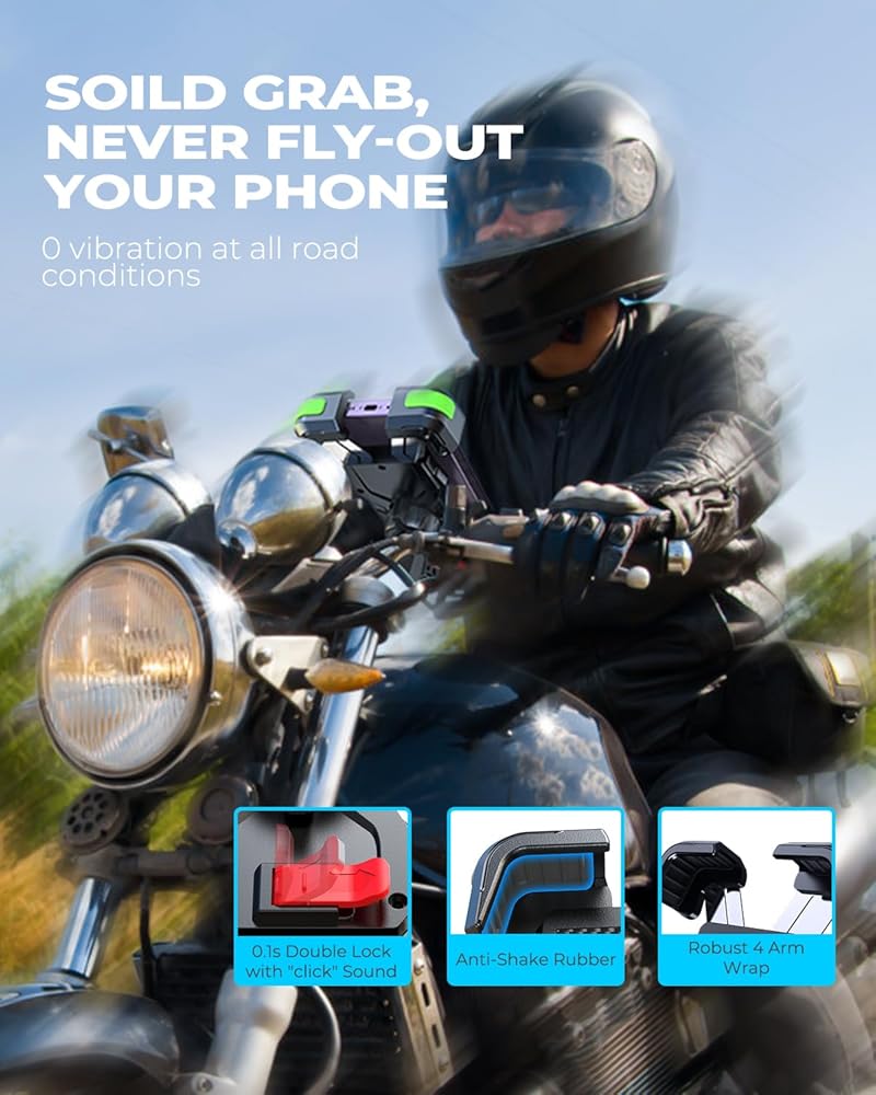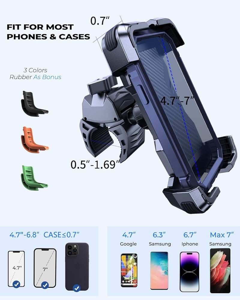 【حماية كاملة للهاتف】تم تصميم 4 أذرع لحامل هاتف الدراجة هذا بشكل أعمق، لذلك فهو سيؤمن بقوة 4 زوايا من هاتفك ويثبت هاتفك بشكل ثابت. مع قفل آمن على الظهر، فإنه يقفل هاتفك مرتين، لذلك لا داعي للقلق من أن هاتفك سيطير بسرعة عالية. تصميم سهل الاستخدام، ولن يحجب الزر الجانبي لهاتفك. !!! متوافق مع الهاتف 4.7 بوصة - 7 بوصة، السمك ≥0.7 بوصة