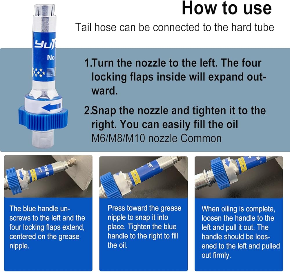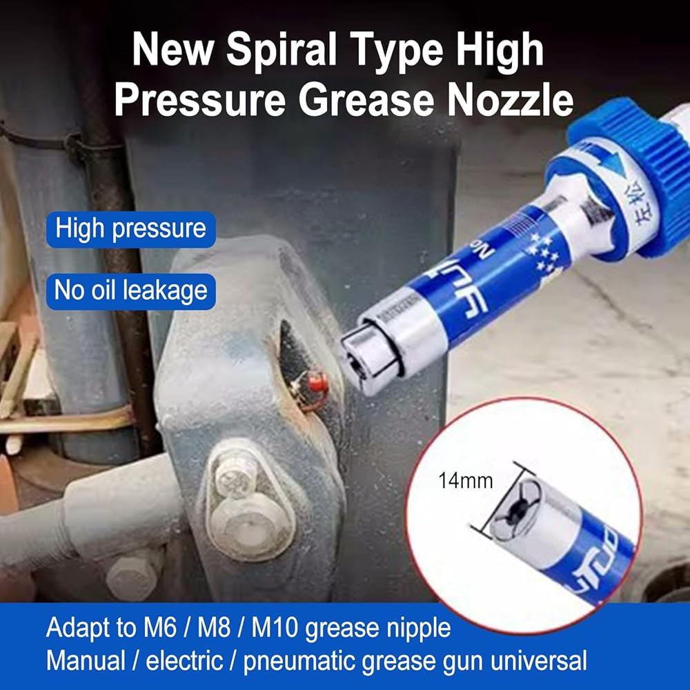 • Feature: Fuel nozzle integrated 4 flap lock, rotatable, left tight right loose, M6/8/10 nozzle universal, this High Pressure Grease Coupler offers universal compatibility that makes it a practical and convenient tool for any maintenance or repair task.