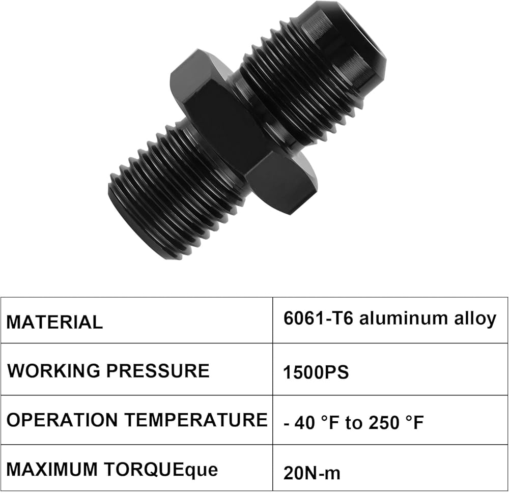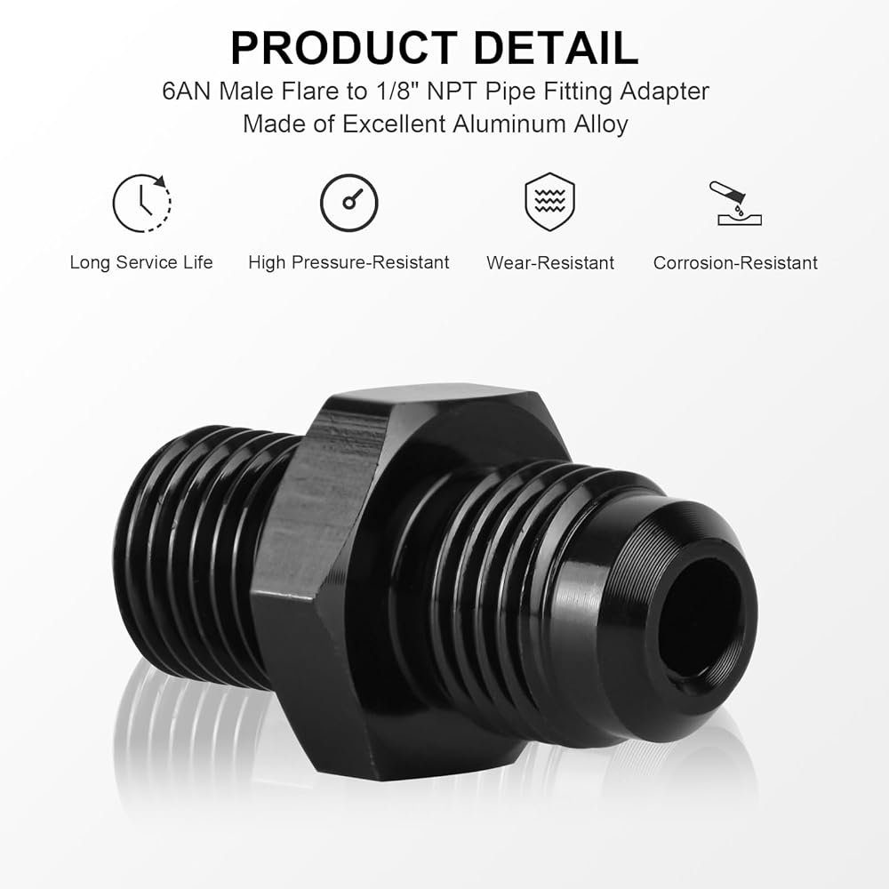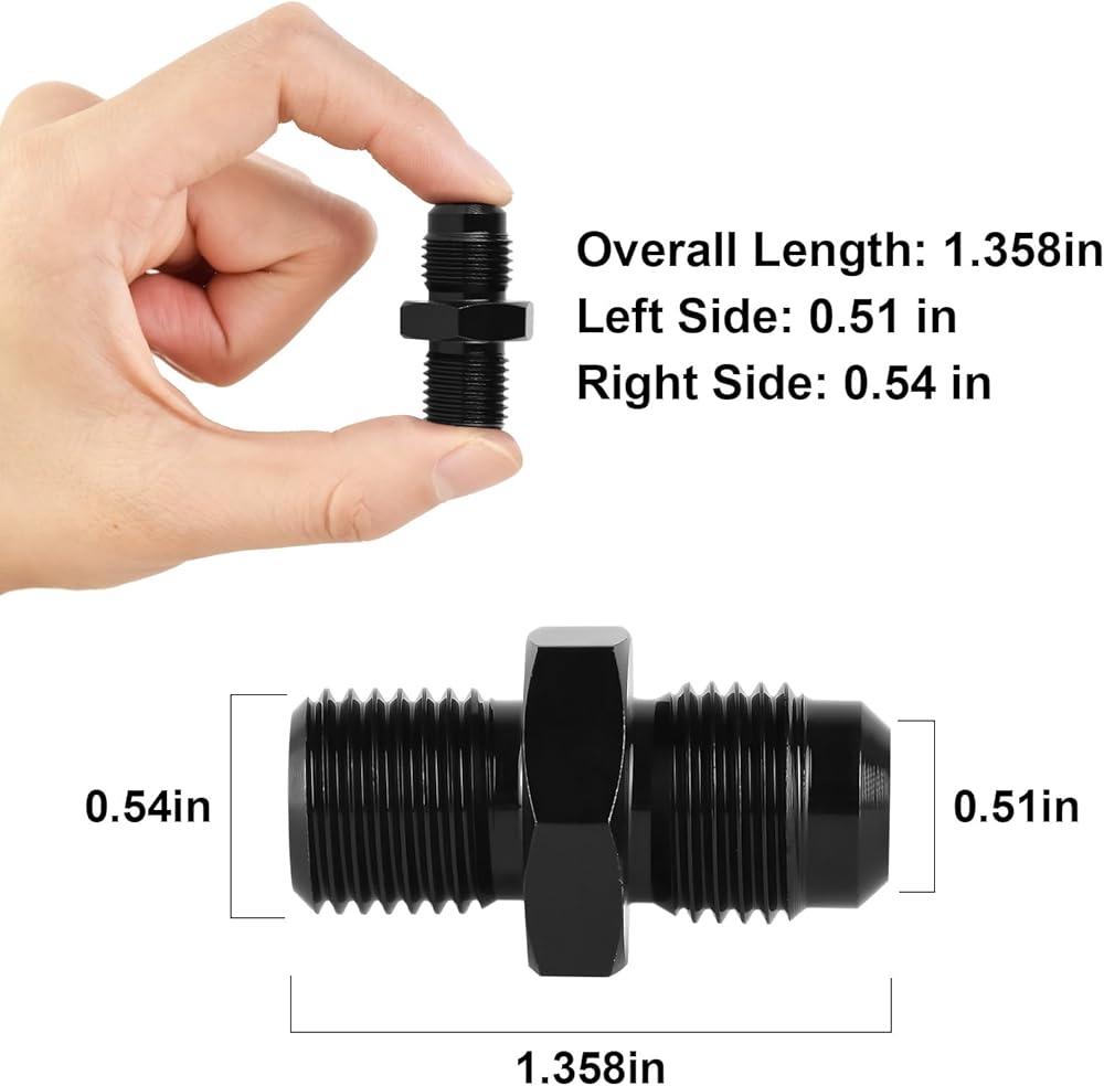 تركيب خط النقل - مجموعة تركيب محول خرطوم الوقود المستقيم الأسود من MuRealy تتضمن قطعتين من التركيبات، هذه التركيبات لها قطر خيط 1/4 NPS يبلغ 0.520 بوصة. AN6 إلى 1/4 بوصة NPS، حجم الخيط 6AN هو 9/16- 18 مؤسسة الأمم المتحدة. يرجى قياس تجهيزات المخزون الخاصة بك لتحديد ما إذا كانت هذه التركيبات 6an ptfe مناسبة قبل الشراء.