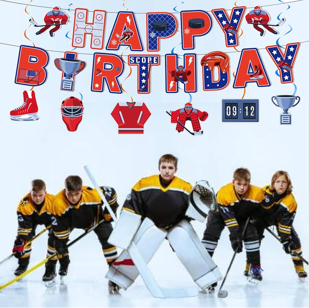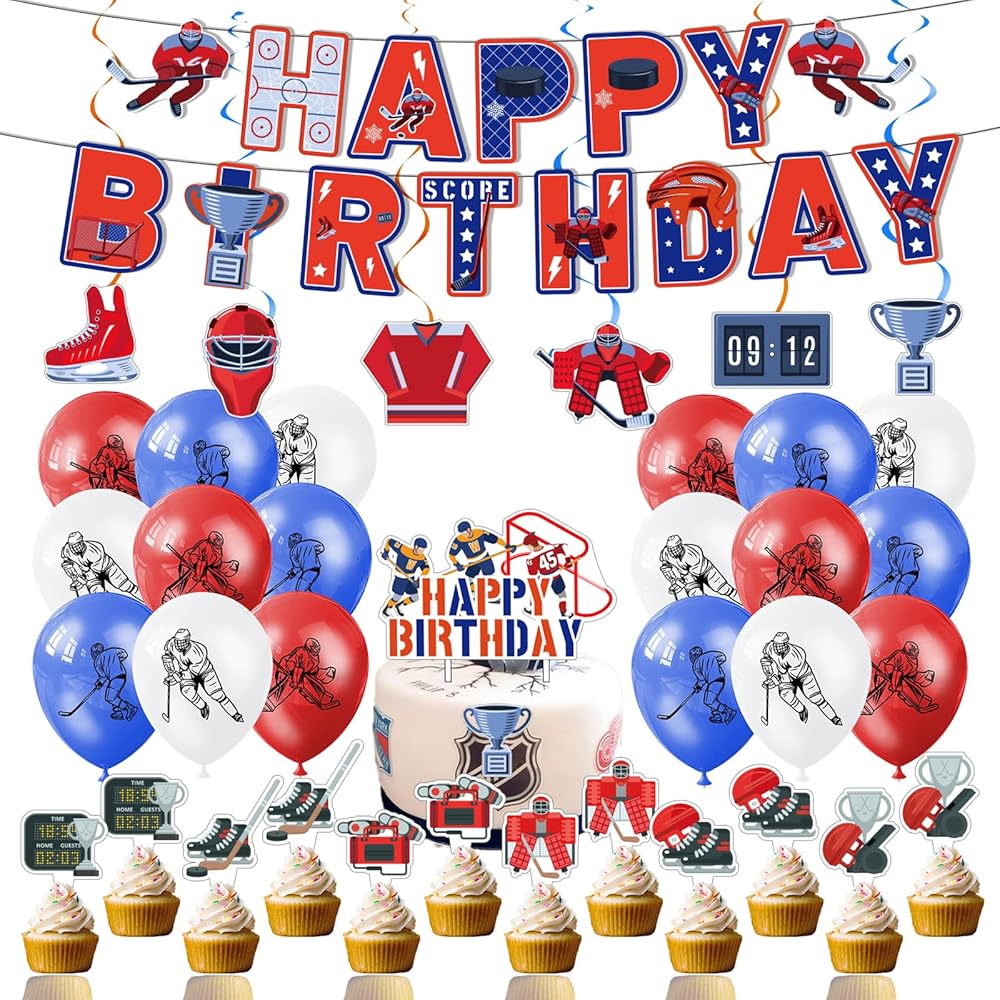Hockey Themed Party Decorations Ice Hockey Birthday Party Supplies Includes Bubble Milk Tea Happy Birthday Banner, Hanging Swirls, Cake Topper, Cupcake Toppers, Balloons.