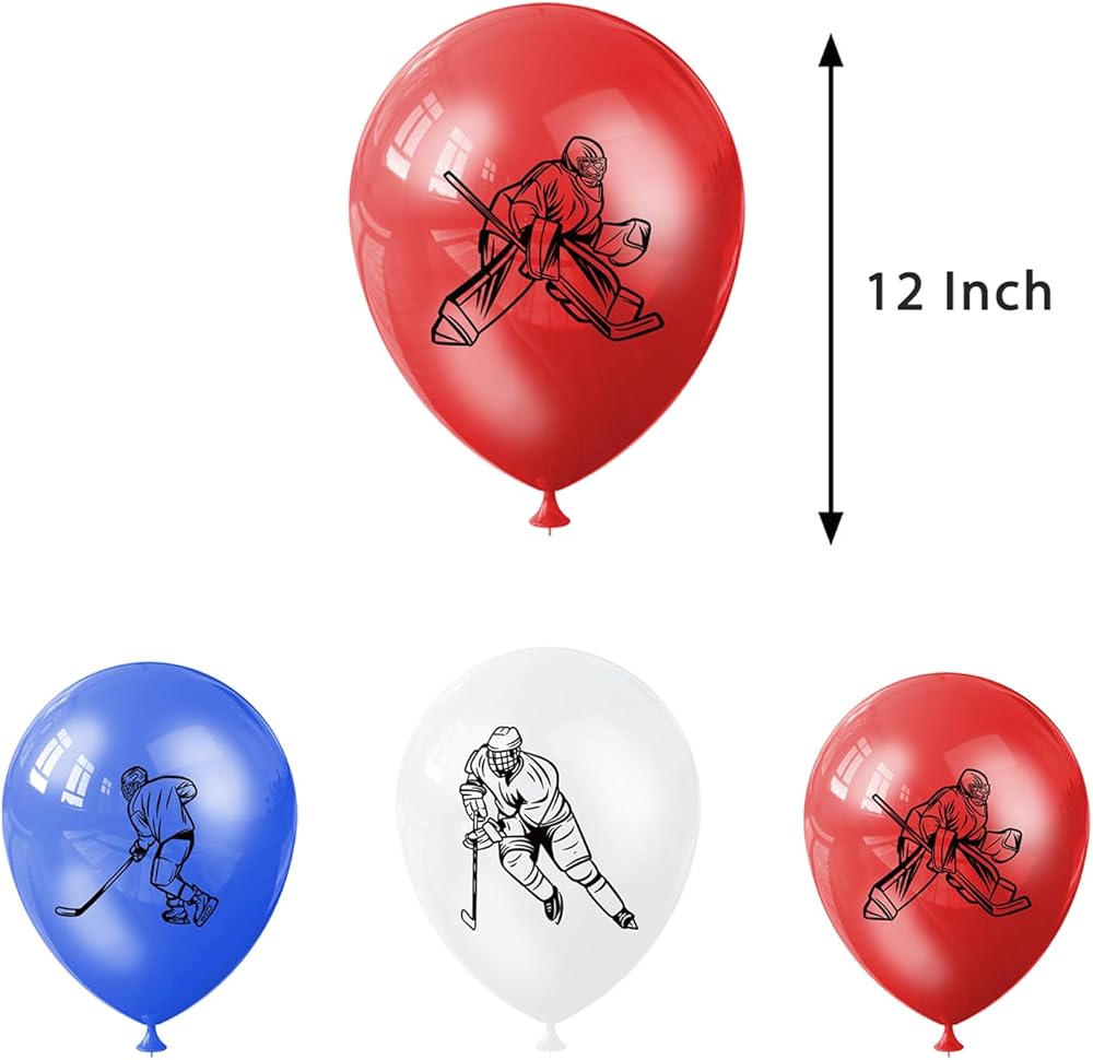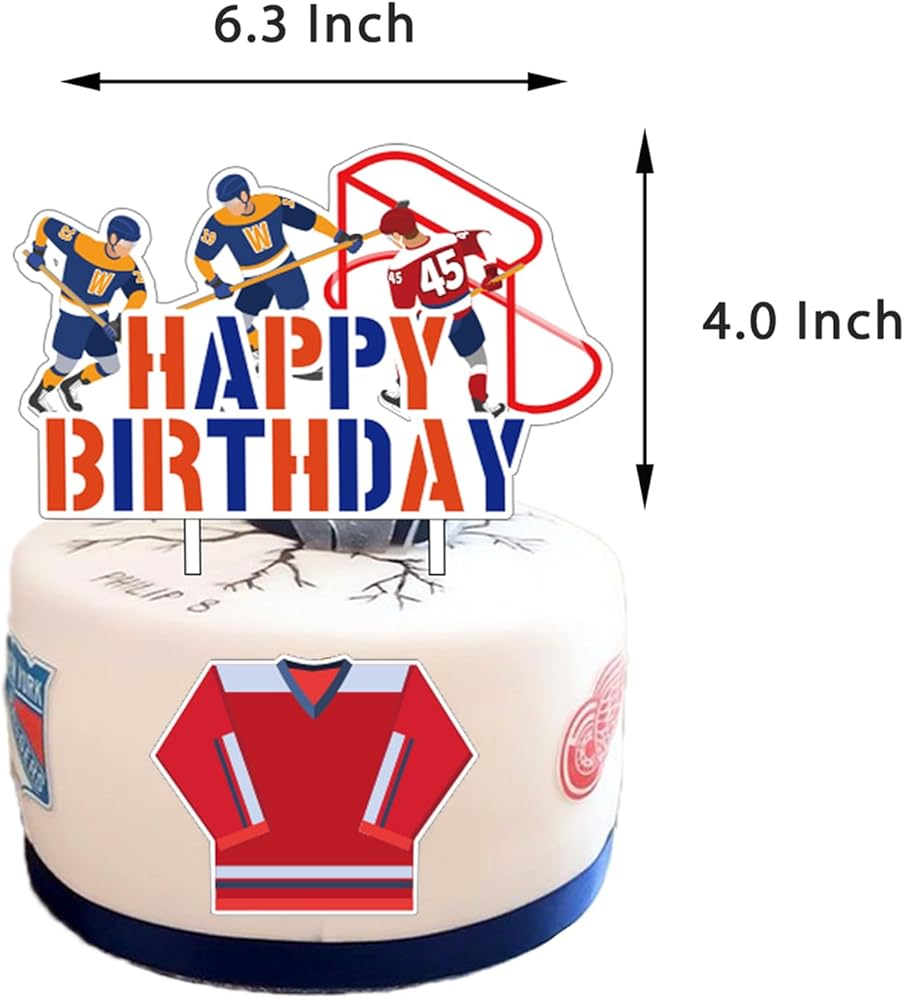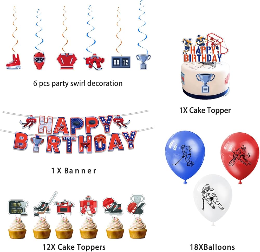 • Ice Hockey Theme Party Supplies: Comes with 1 roll of balloon ribbon, You will get 1 happy birthday banner, 6 hanging swirls, 18 balloons, 1 big happy birthday cake topper and 12 cupcake toppers, hockey element add more fun to your party!
